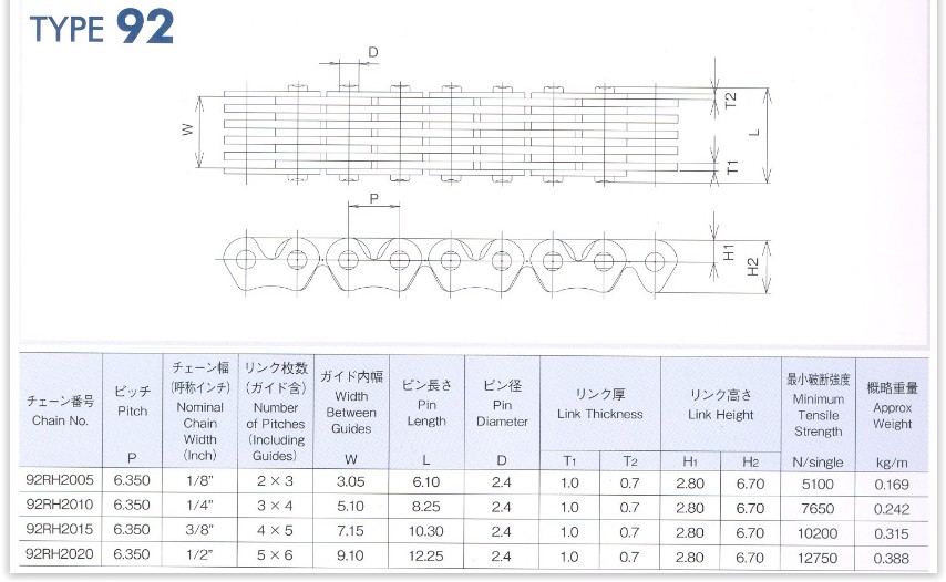 Provedení řetězu - spojený z výroby. Typ řetězu 92RH2010.