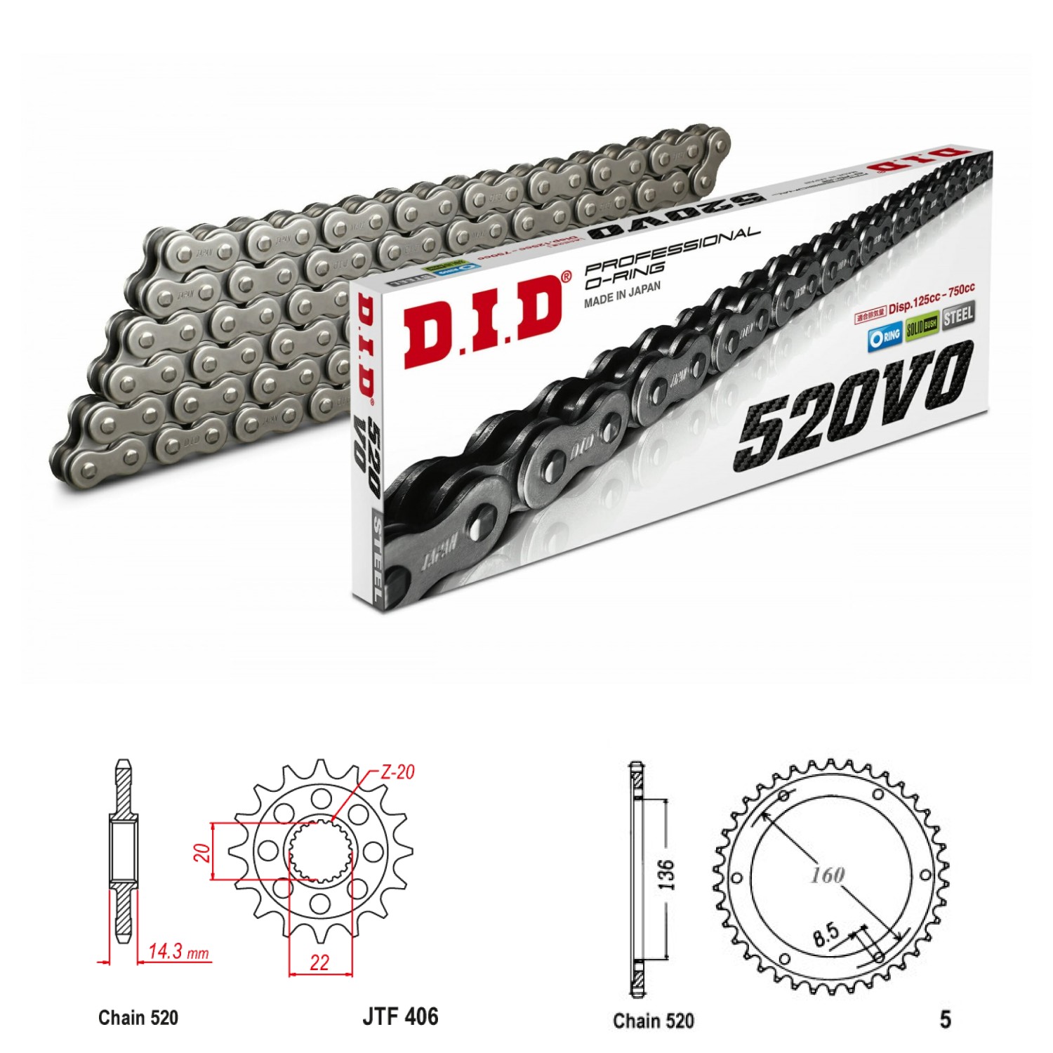 DID Řetězová sada D.I.D O-ring, BMW G 310 R, GS rok výroby 2016-2024, Řetěz DID 520 V0, O-ring, počet článků 112, kolečko 406-16 zubů, rozeta 0005-40 zubů.