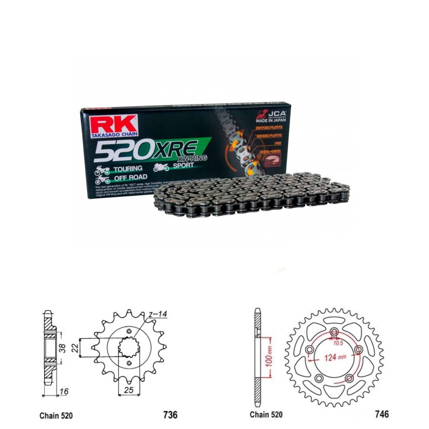Řetězová sada RK W-ring, DUCATI 800 Scrambler rok výroby 2015-2024, Řetěz RK 520 XRE, XW-ring, počet článků 108, kolečko 736-15 zubů, rozeta 0746-46 zubů.