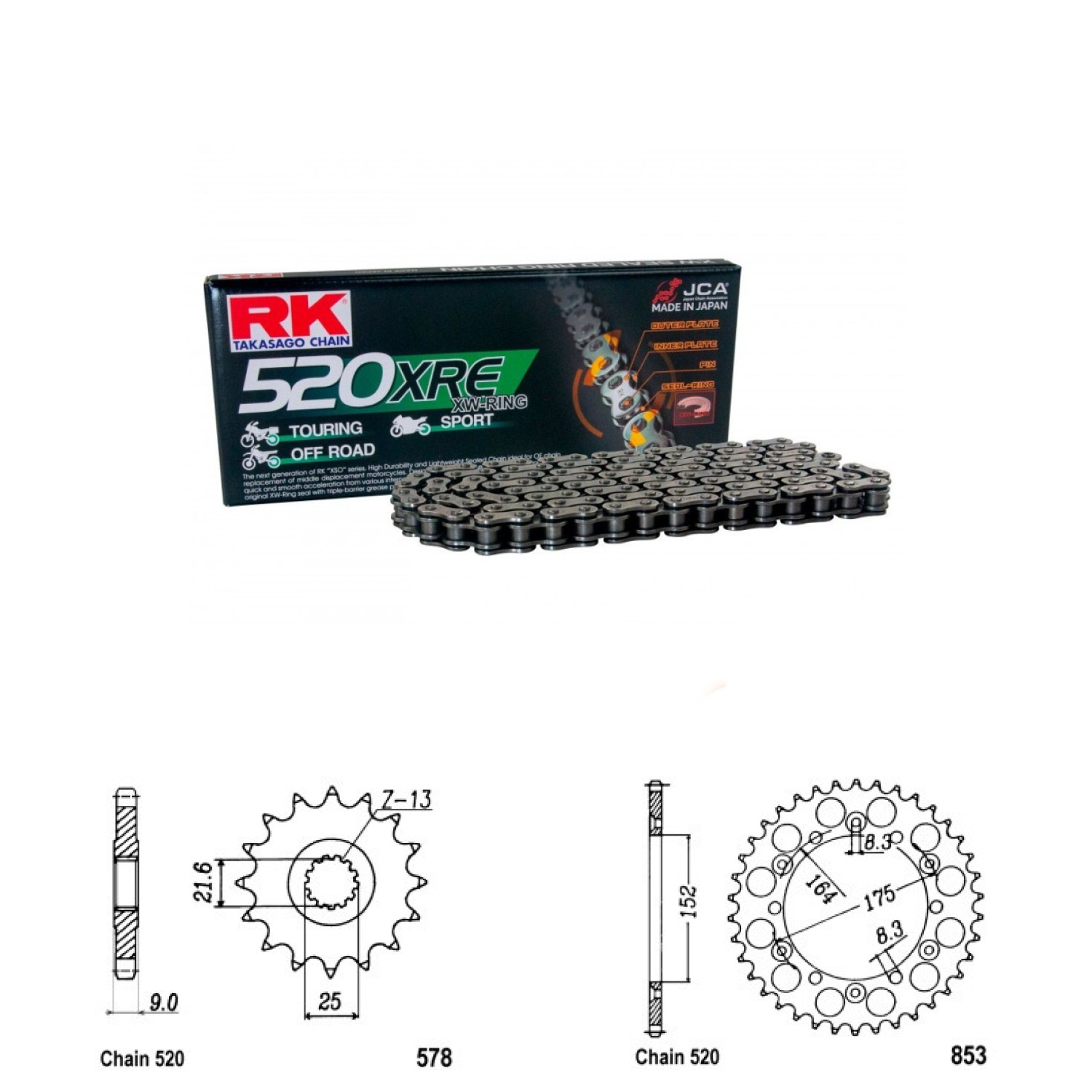 Řetězová sada RK W-ring, YAMAHA SR 500 řetěz 520 rok výroby 1991-2000, Řetěz RK 520 XRE, XW-ring, počet článků 104, kolečko 578-15 zubů, rozeta 0853-41 zubů.