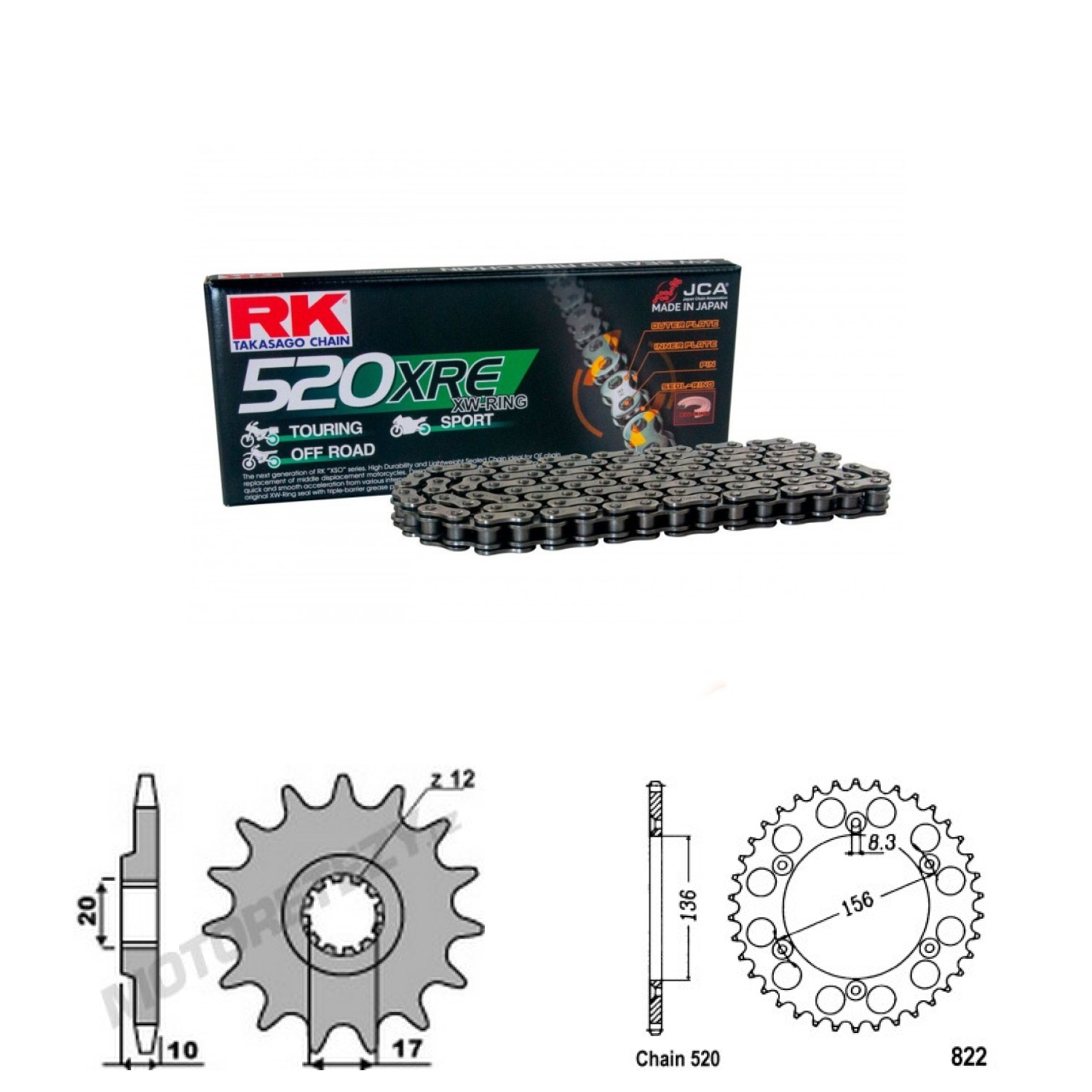 Řetězová sada RK W-ring, HUSQVARNA 125 CR rok výroby 1995-2009, Řetěz RK 520 XRE, XW-ring, počet článků 118, kolečko P2074-13 zubů, rozeta 0822-50 zubů.