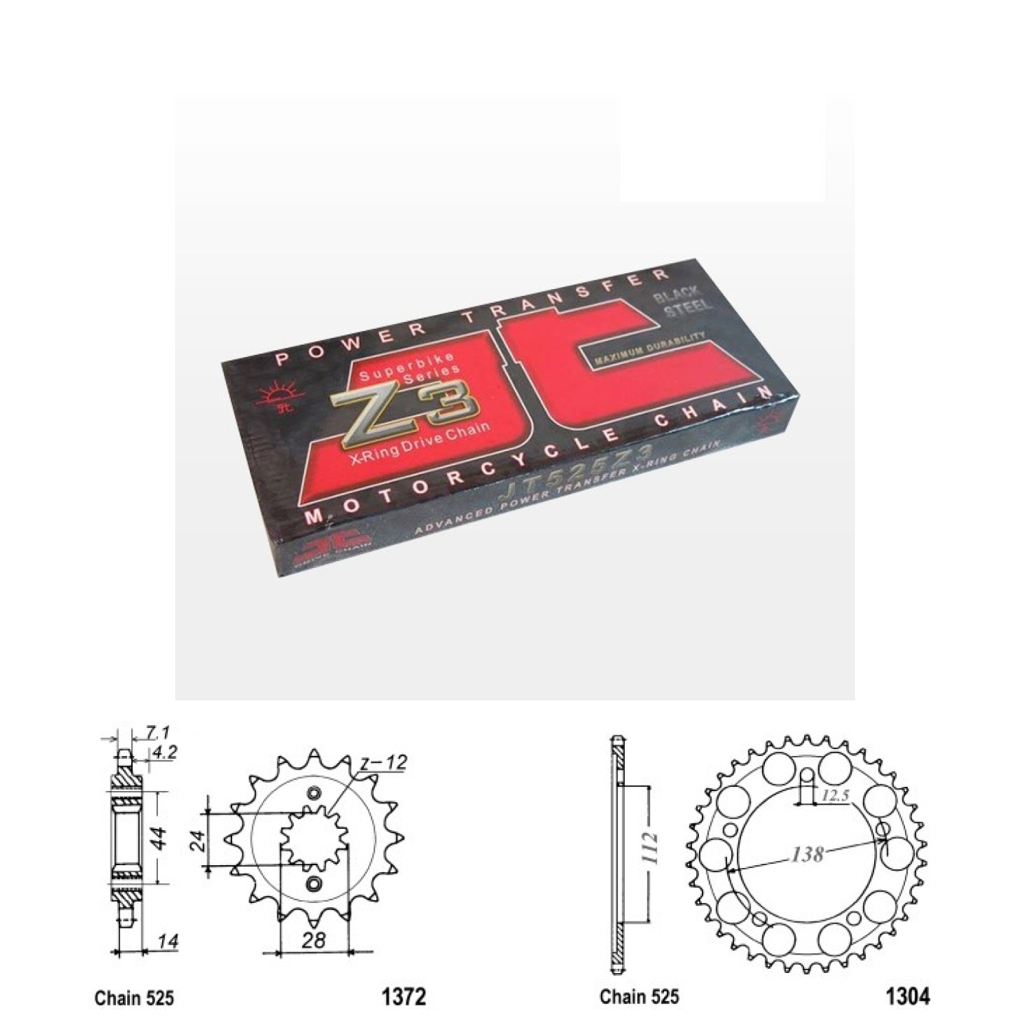 Řetězová sada JT ZX-ring, HONDA VT 750 DC Shadow Spirit rok výroby 2001-2006, Řetěz JT 525 Z3, X-ring, počet článků 122, kolečko 1372-17 zubů, rozeta 1304-42 zubů.