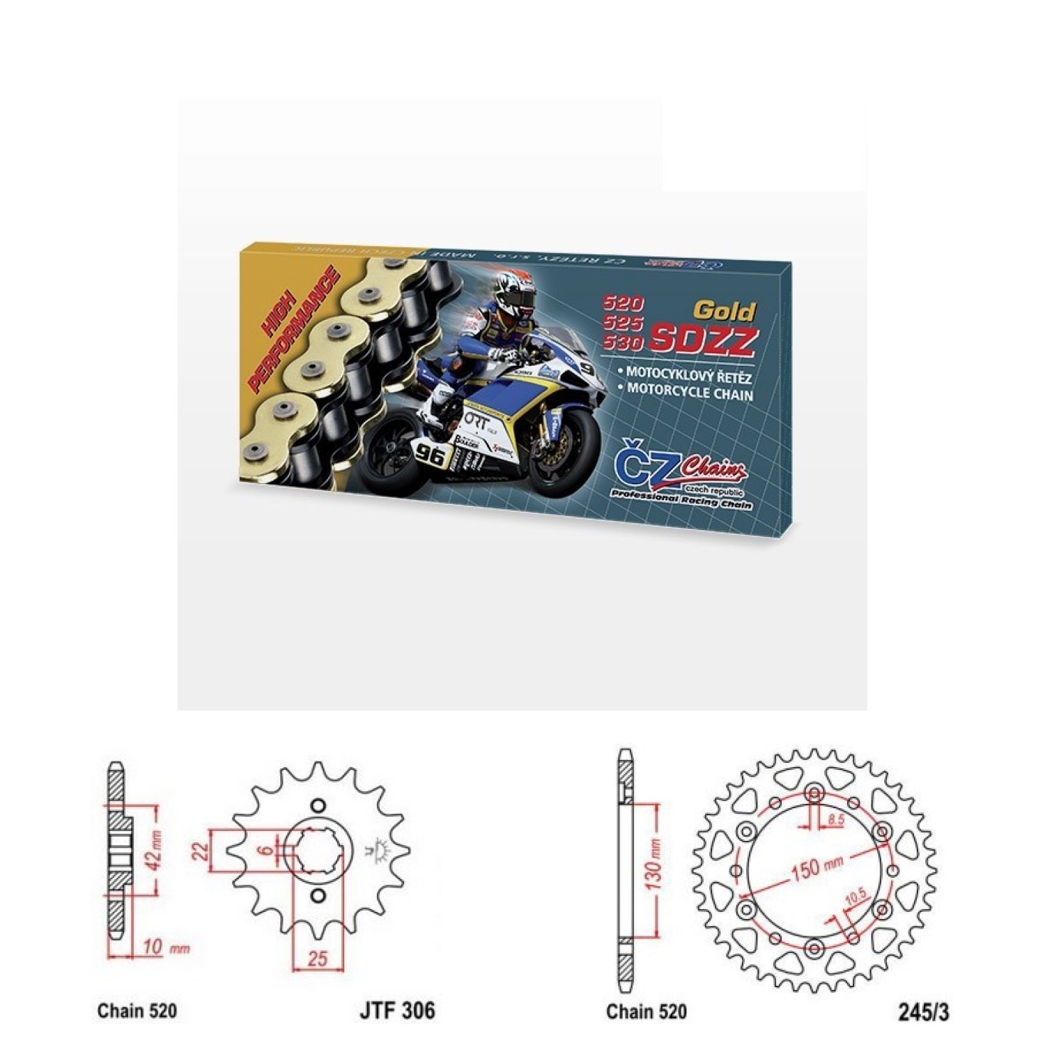Řetězová sada s ČZ HX-ring GOLD, HONDA NX 650 Dominator rok výroby 1988-, Řetěz ČZ 520 SDZZ, X-ring, zlatý, počet článků 108, kolečko 306-15 zubů, rozeta 0245/3-45 zubů.