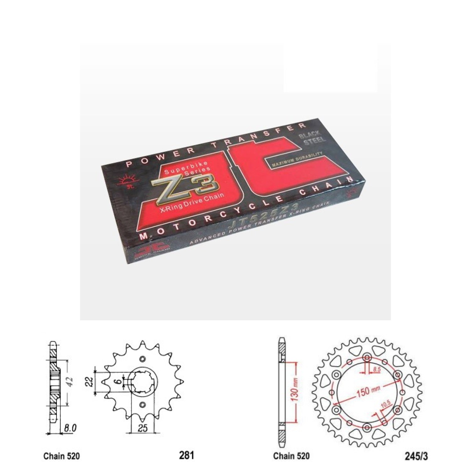 Řetězová sada JT ZX-ring, HONDA XR 600 rok výroby 1988-1990, Řetěz JT 520 Z3, X-ring, počet článků 112, kolečko 281-14 zubů, rozeta 0245/3-50 zubů.