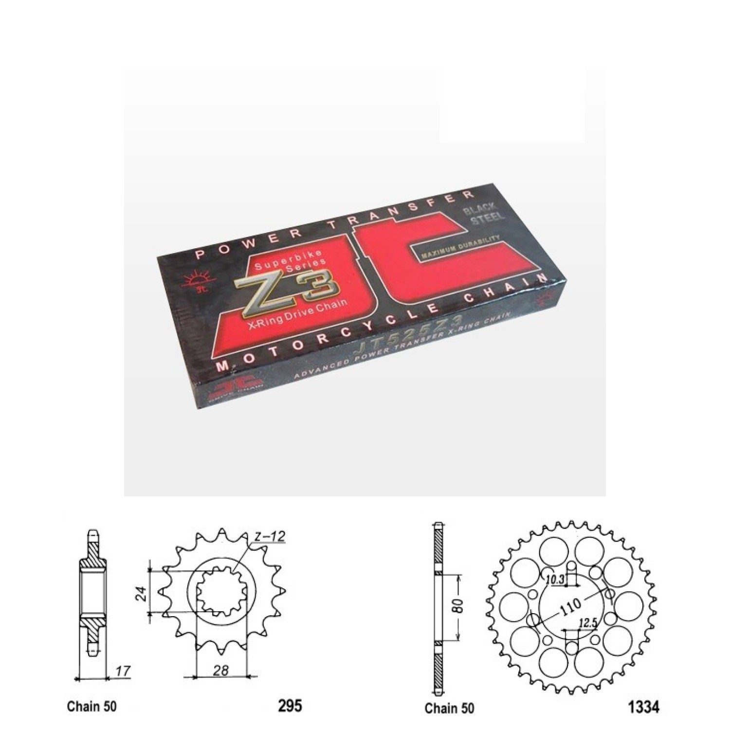 Řetězová sada JT ZX-ring, HONDA CBR 600 F rok výroby 1987-1990, Řetěz JT 530 Z3, X-ring, počet článků 110, kolečko 295-15 zubů, rozeta 1334-43 zubů.