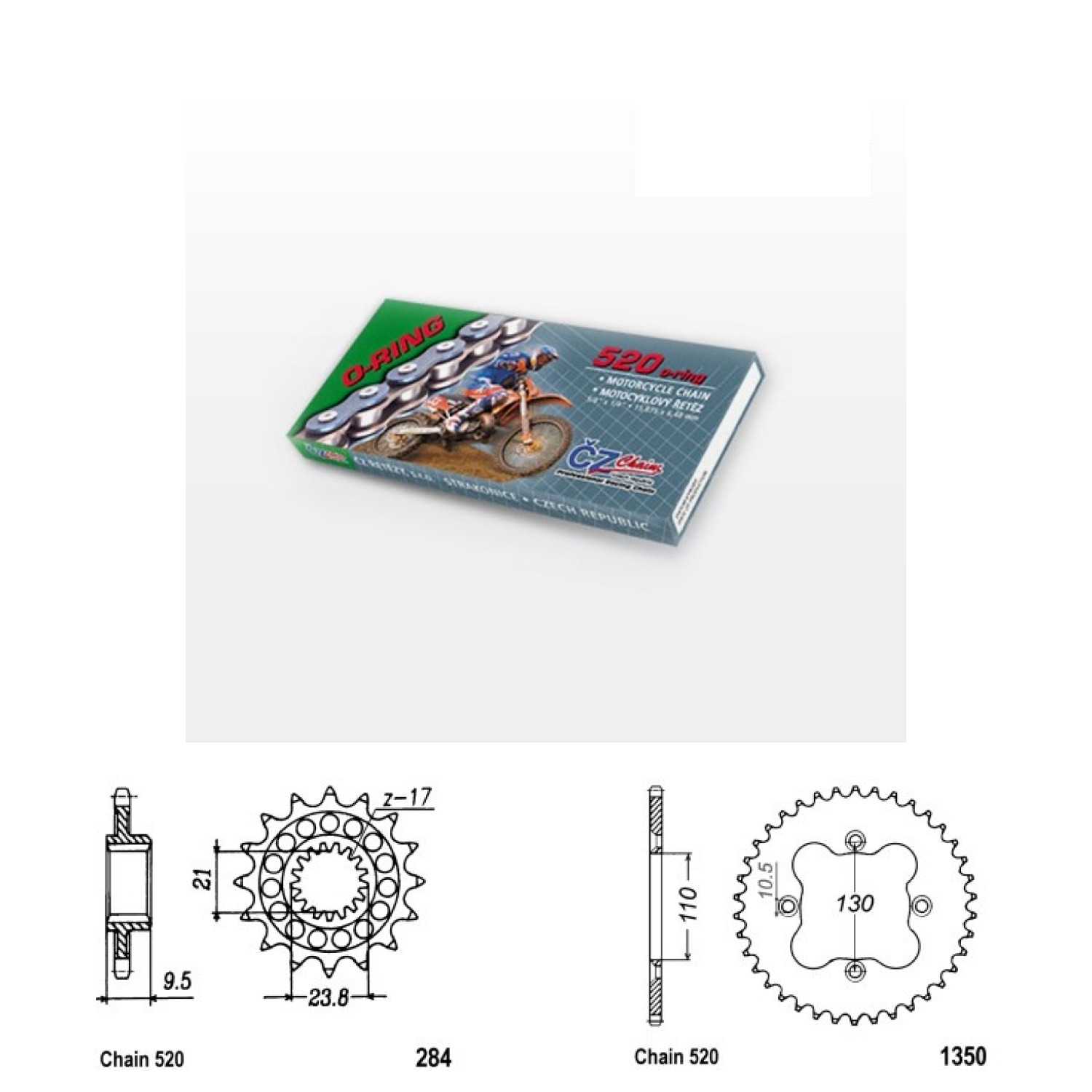 Řetězová sada s ČZ O-ring, HONDA TRX 450R rok výroby 2006-2008, Řetěz ČZ 520 ORM, O-ring, počet článků 94, kolečko 284-13 zubů, rozeta 1350-38 zubů.
