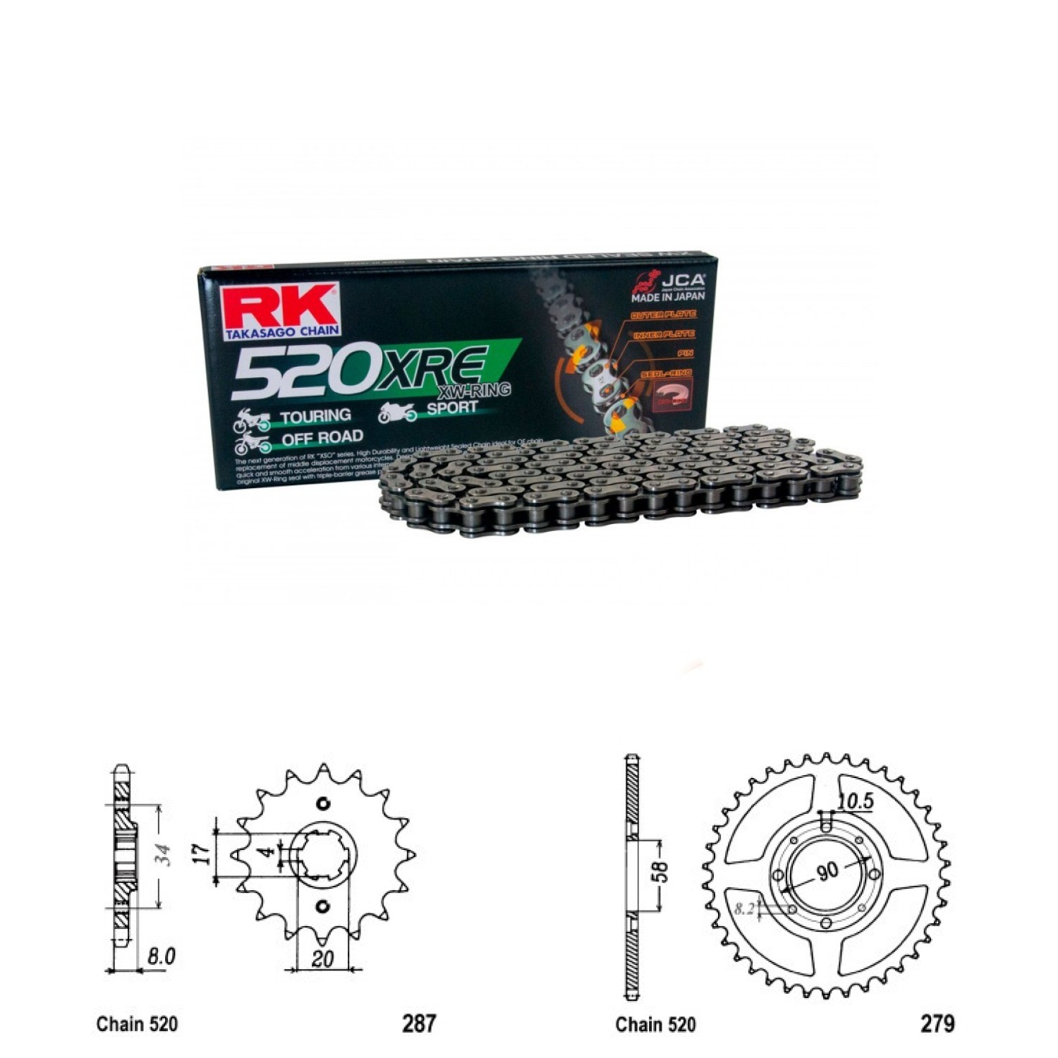 Řetězová sada RK W-ring, HONDA CB 250 Night Hawk rok výroby 1991-1997, Řetěz RK 520 XRE, XW-ring, počet článků 108, kolečko 287-14 zubů, rozeta 0279-33 zubů.