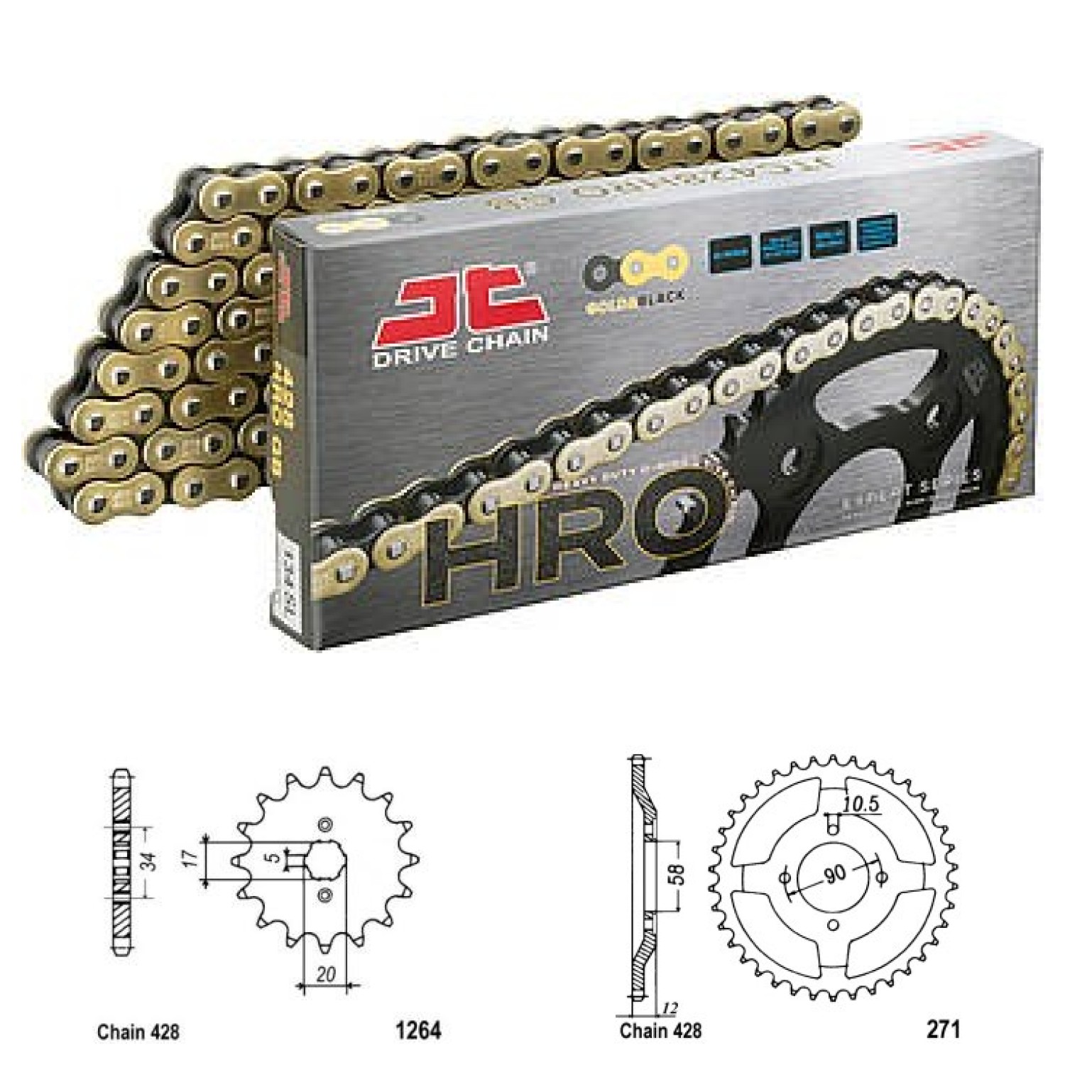 Řetězová sada JT O-ring GOLD, HONDA CLR 125 W,X,Y Cityfly rok výroby 1998-2003, Řetěz JT 428 HRO, zlatý, O-ring,, počet článků 128, kolečko 1264-17 zubů, rozeta 0271-50 zubů.