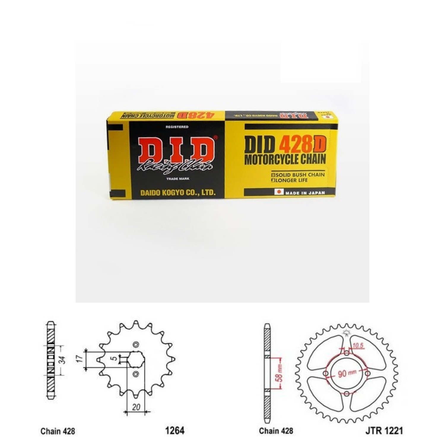 DID Řetězová sada D.I.D standard, HONDA CBR 125 R rok výroby 2011-2017, Řetěz DID 428 D, bezkroužkový, počet článků 128, kolečko 1264-15 zubů, rozeta 1221-44 zubů.