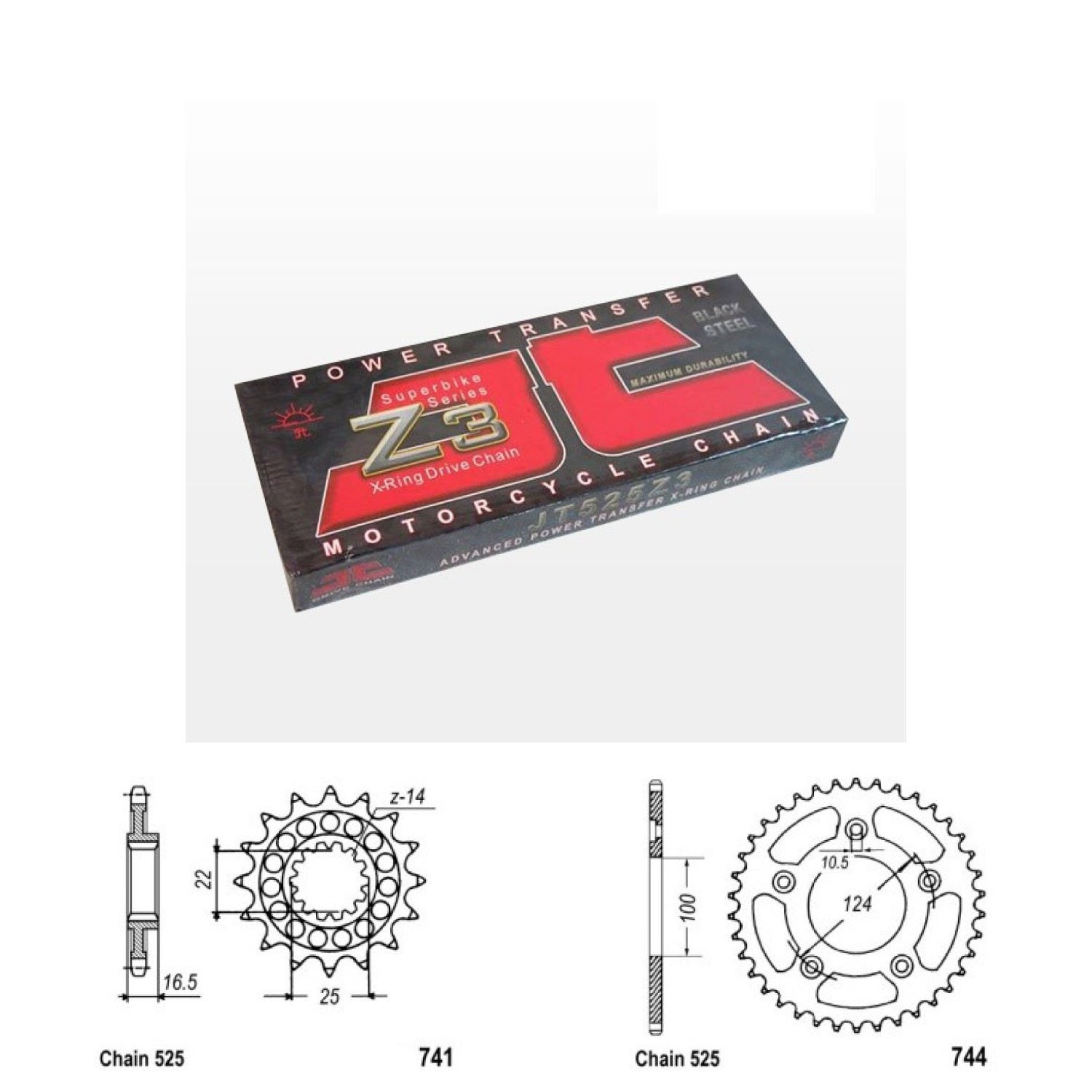 Řetězová sada JT ZX-ring, DUCATI 749 R rok výroby 2006-, Řetěz JT 525 Z3, X-ring, počet článků 98, kolečko 741-15 zubů, rozeta 0744-36 zubů.