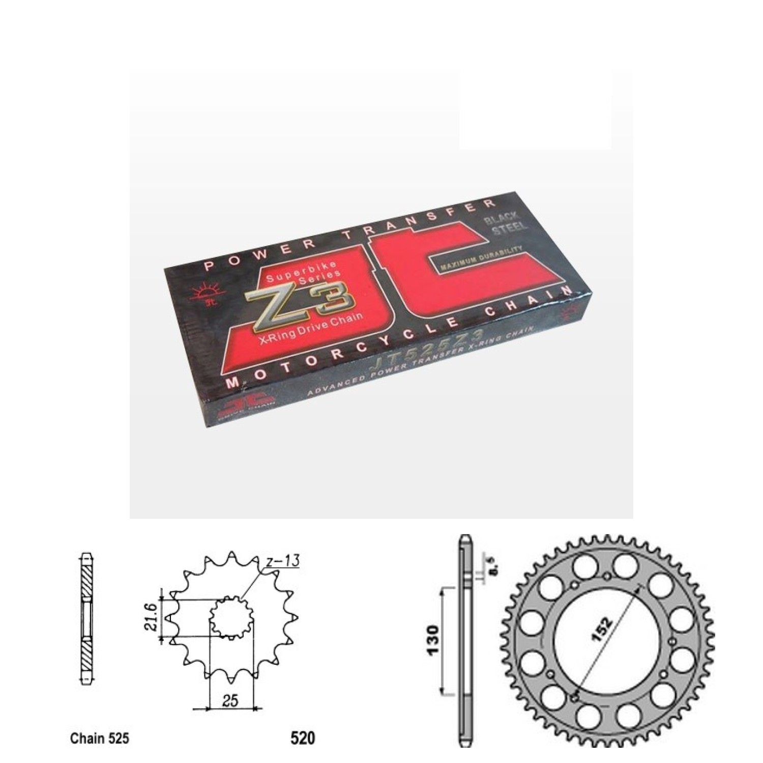 Řetězová sada JT ZX-ring, CAGIVA 1000 Navigator rok výroby 2001-2004, Řetěz JT 525 Z3, X-ring, počet článků 108, kolečko 520-16 zubů, rozeta P4424-41 zubů.