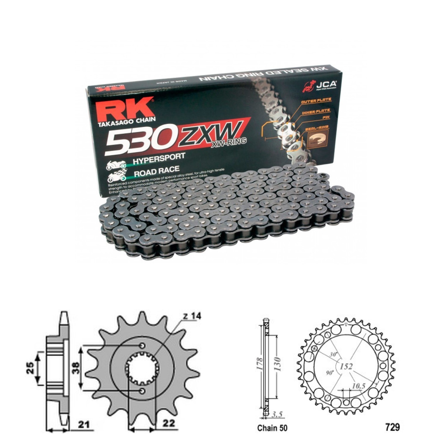 Řetězová sada RK ZW-ring, CAGIVA 750 Elefant rok výroby 1993-1998, Řetěz RK 530 ZXW, XW-ring, počet článků 108, kolečko P2079-15 zubů, rozeta 0729-46 zubů.