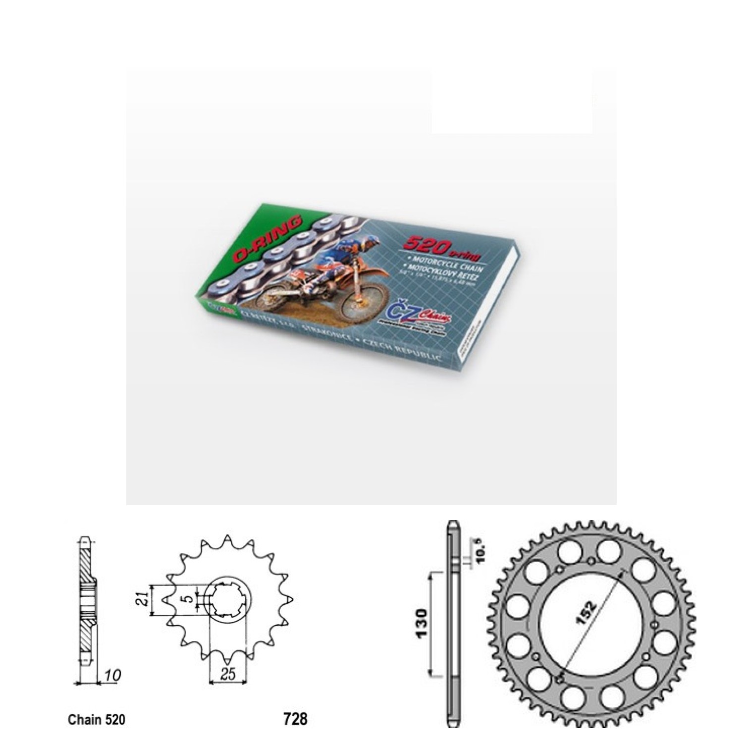 Řetězová sada s ČZ O-ring, CAGIVA 600 Canyon rok výroby 1996-1999, Řetěz ČZ 520 ORM, O-ring, počet článků 112, kolečko 728-15 zubů, rozeta P4376-45 zubů.