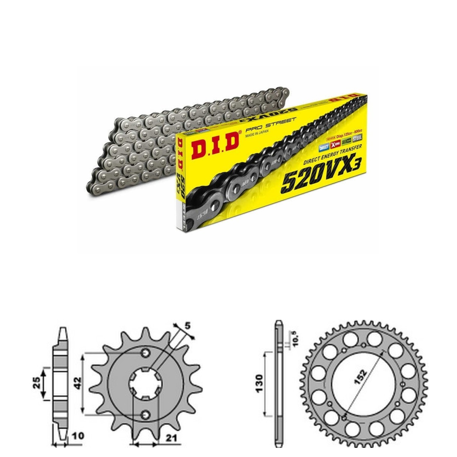 D.I.D. 520 VX3 - vylepšený těsněný DID řetěz s těsnícím "X" kroužkem střední kvalitativní řady, pokračovatel oblíbeného řetězu DID 520VX/DID 520VX2 s posílenou odolností proti opotřebení (až o 32%).Díky špičkové technologii výroby má šířku 18,7mm ( o min. 3mm užší než srovnatelné řetězy) při zachování vysoké pevnosti v tahu (37,2kN).
