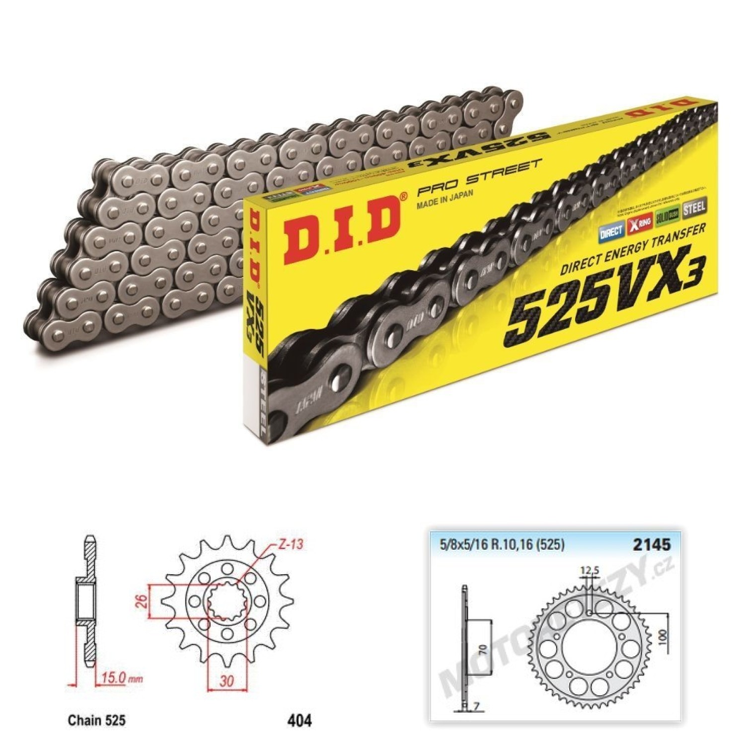 D.I.D. 525 VX3 - střední kvalitativní řada DID - řetěz s těsnícím "X" kroužkem, pokračovatel řetězu DID 525V/DID 525VX. Populární řetěz např. pro Suzuki DL 650, Honda CB 600 F Hornet apod.