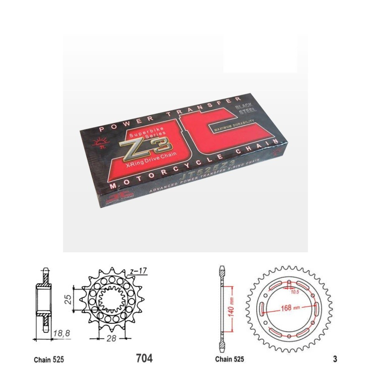 Řetězová sada JT ZX-ring, BMW F 650 GS (800ccm) rok výroby 2009-2012, Řetěz JT 525 Z3, X-ring, počet článků 116, kolečko 704-17 zubů, rozeta 0003-41 zubů.