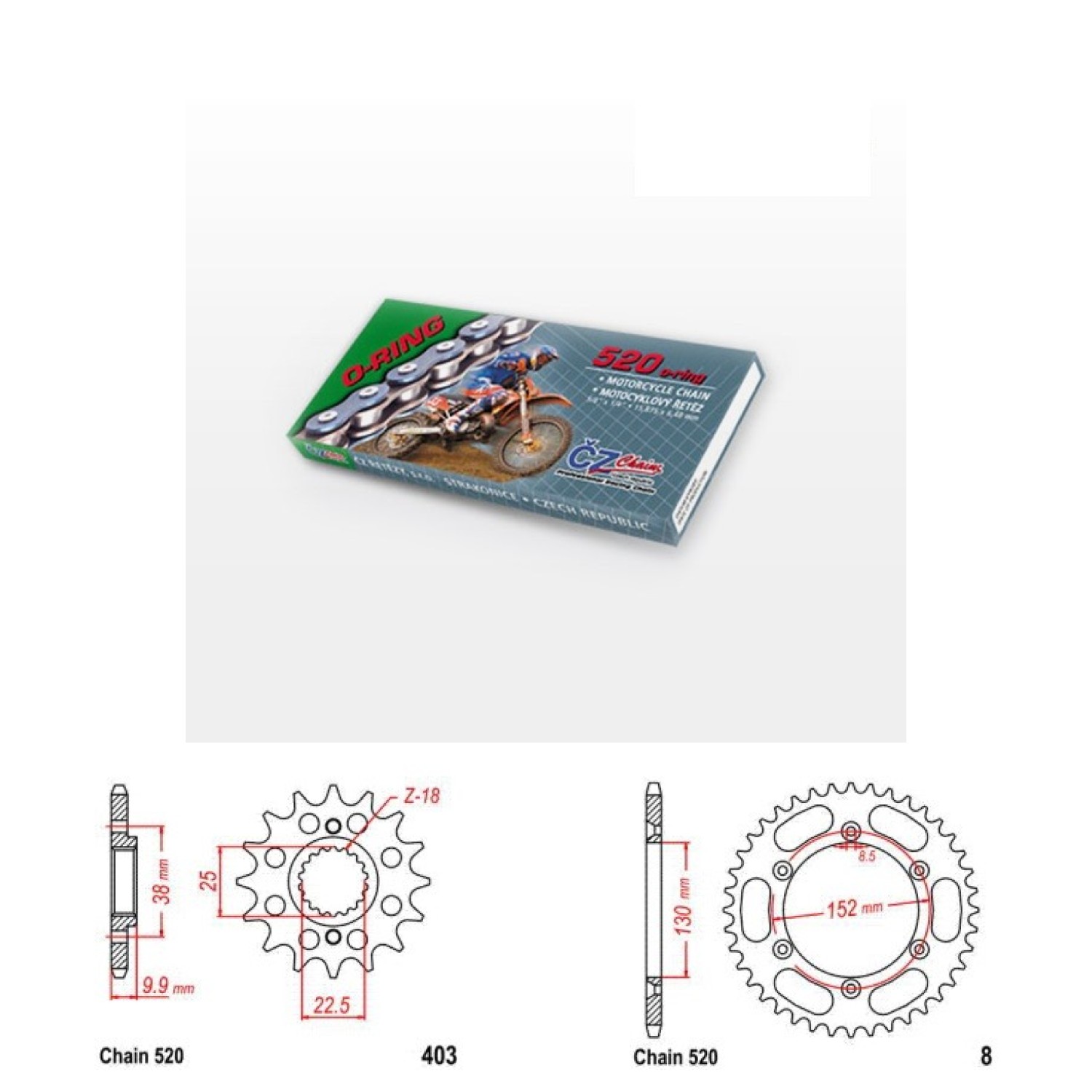 Řetězová sada s ČZ O-ring, BMW G 450 X rok výroby 2007-2010, Řetěz ČZ 520 ORM, O-ring, počet článků 114, kolečko 403-15 zubů, rozeta 0008-48 zubů.