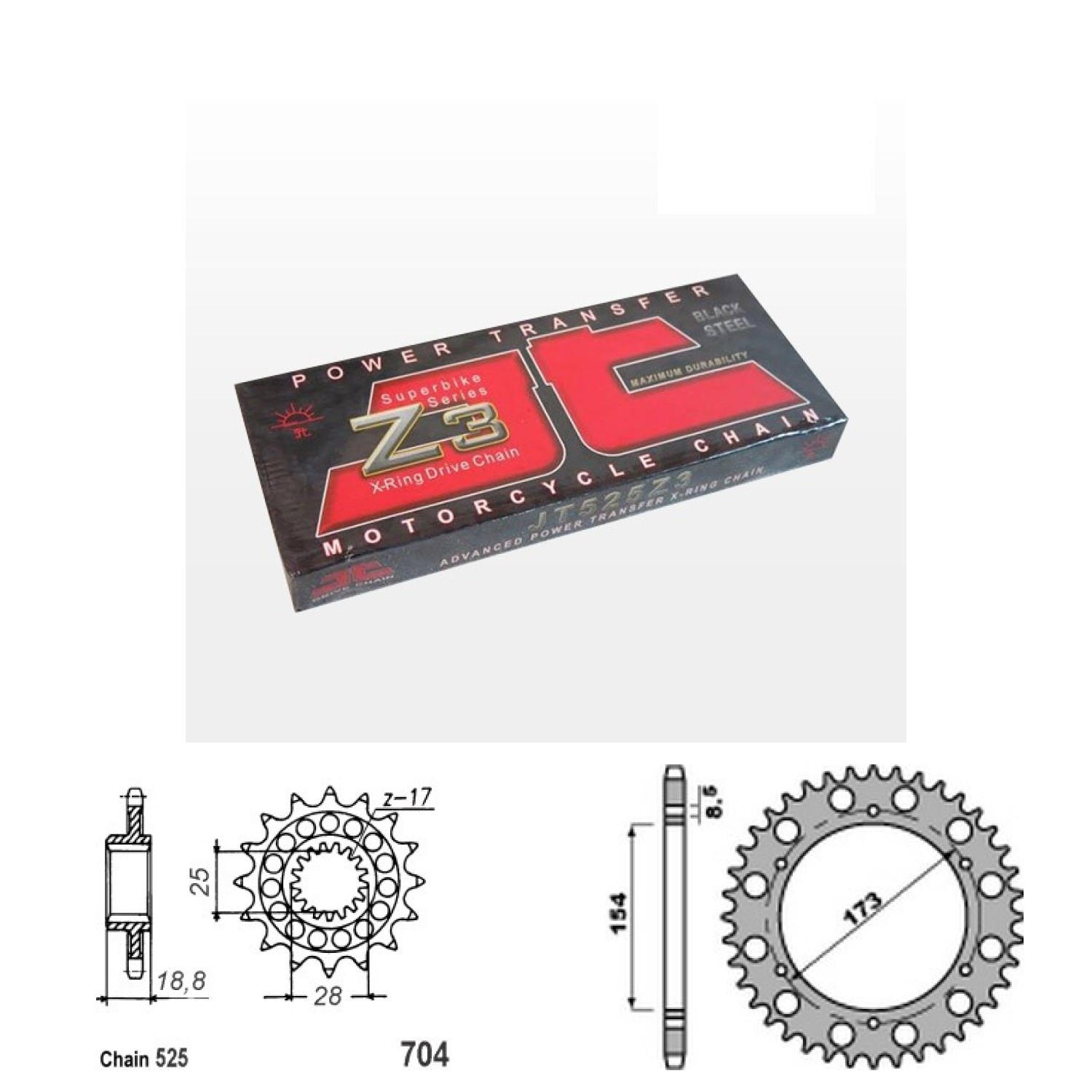 Řetězová sada JT ZX-ring, APRILIA 1000 RST Futura rok výroby 2001-2004, Řetěz JT 525 Z3, X-ring, počet článků 108, kolečko 704-16 zubů, rozeta P4441-43 zubů.