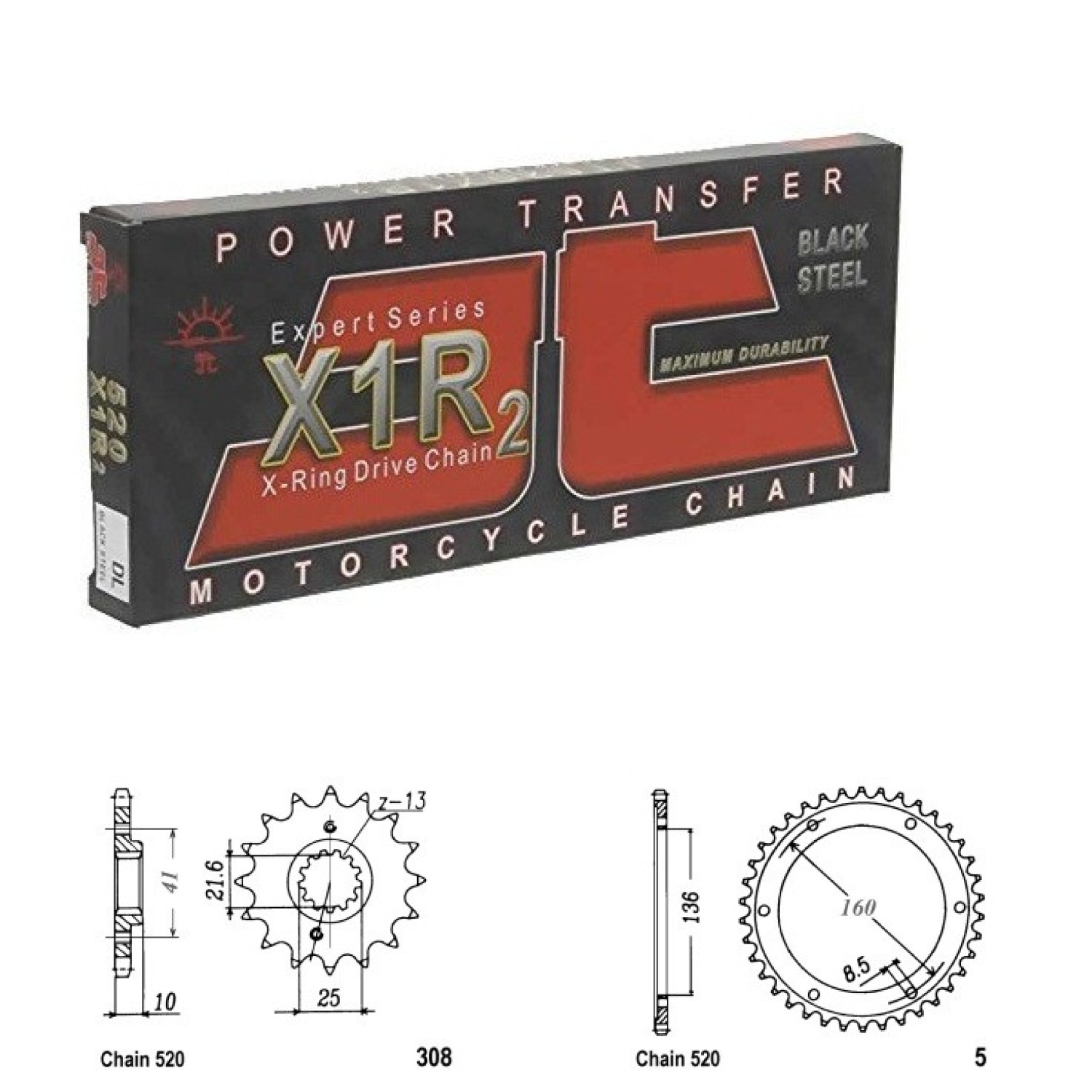 Řetězová sada JT X-ring, APRILIA 650 Pegaso Trail rok výroby 2007-2010, Řetěz JT 520 X1R, X-ring, počet článků 110, kolečko 308-15 zubů, rozeta 0005-44 zubů.