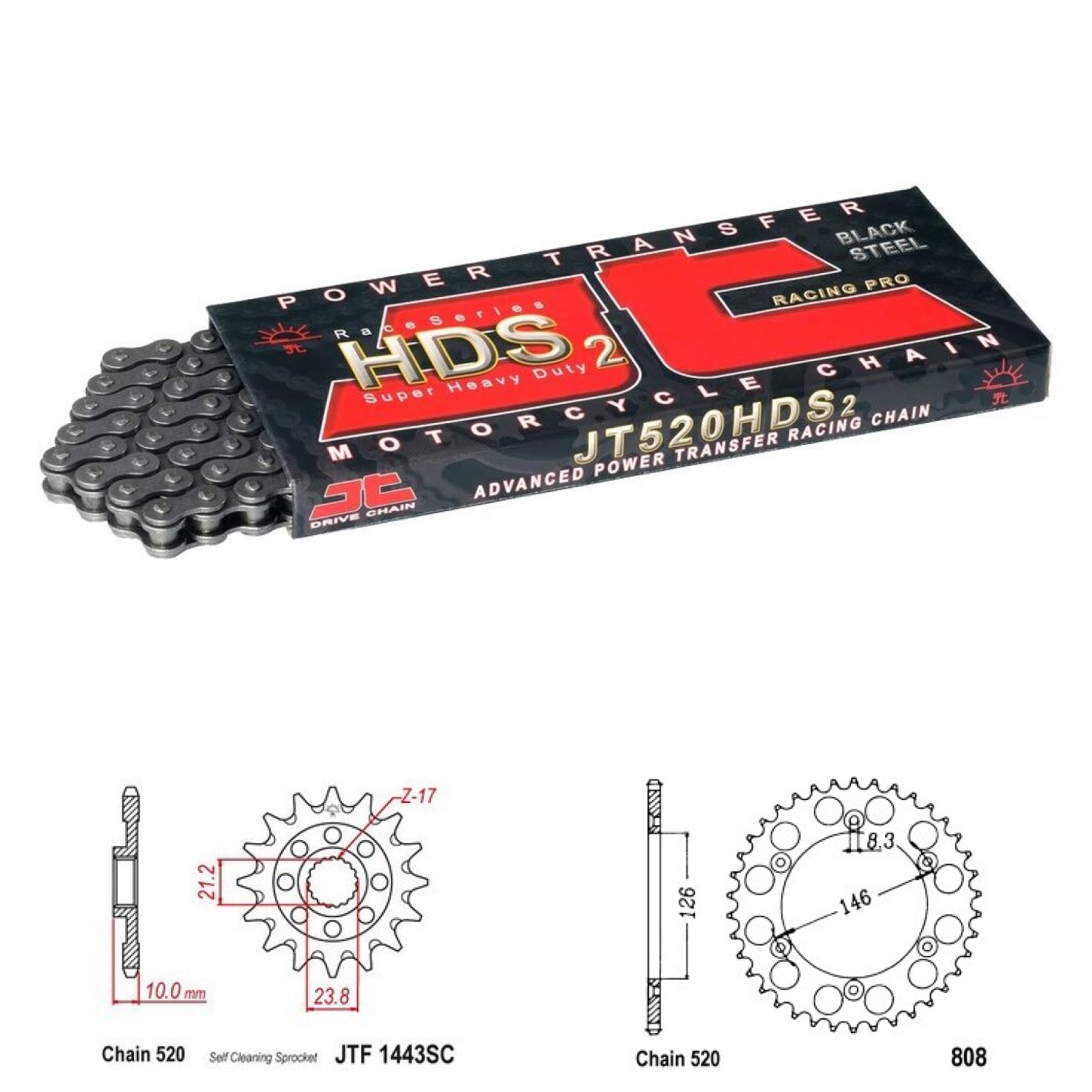 Řetězová sada JT, SUZUKI RM-Z 450 rok výroby 2013-2026, Řetěz JT 520 HDS, bezkroužkový, zesílený, počet článků 114, kolečko 1443-13 zubů, rozeta 0808-50 zubů.