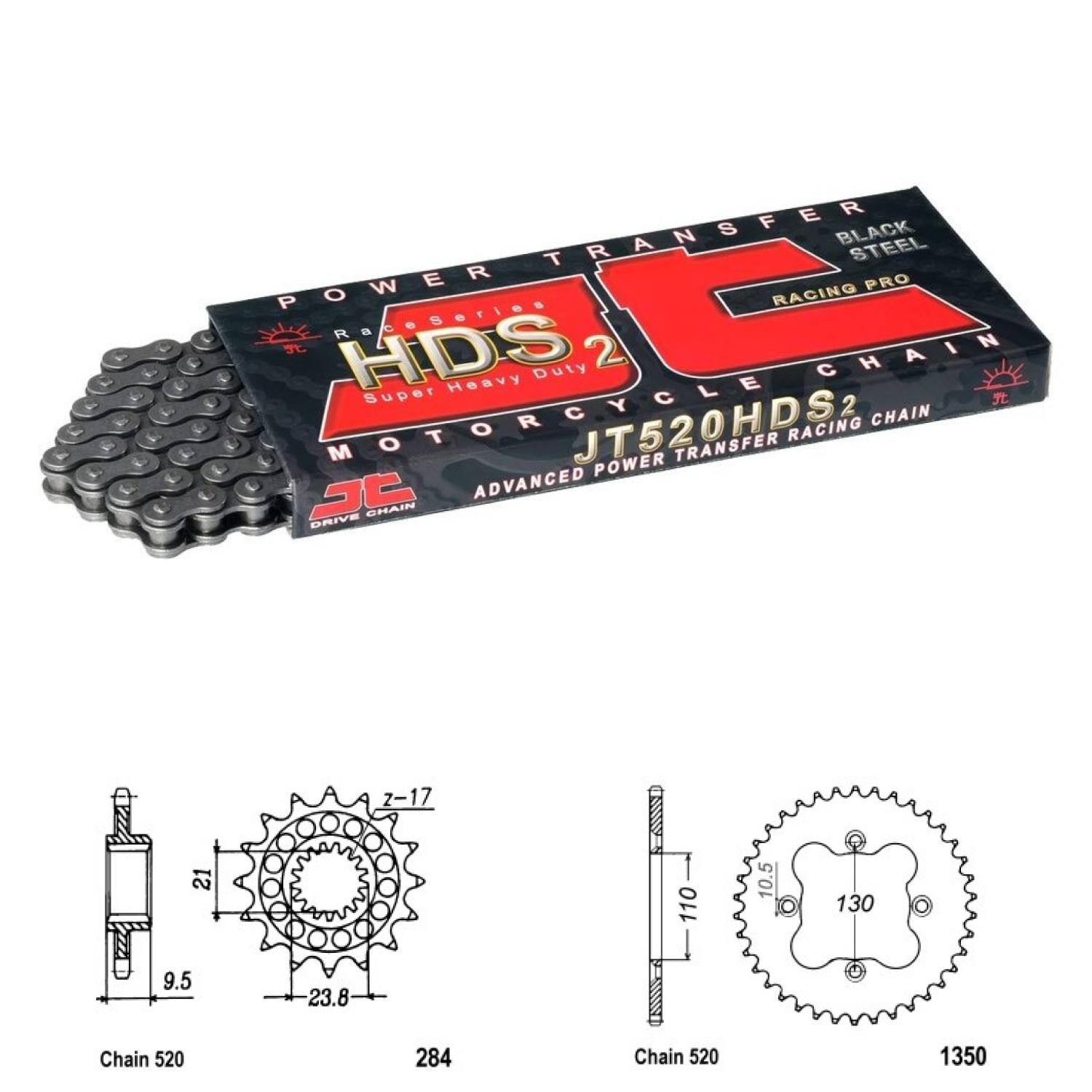Řetězová sada JT, HONDA TRX 450R rok výroby 2009-, Řetěz JT 520 HDS, bezkroužkový, zesílený, počet článků 96, kolečko 284-13 zubů, rozeta 1350-38 zubů.