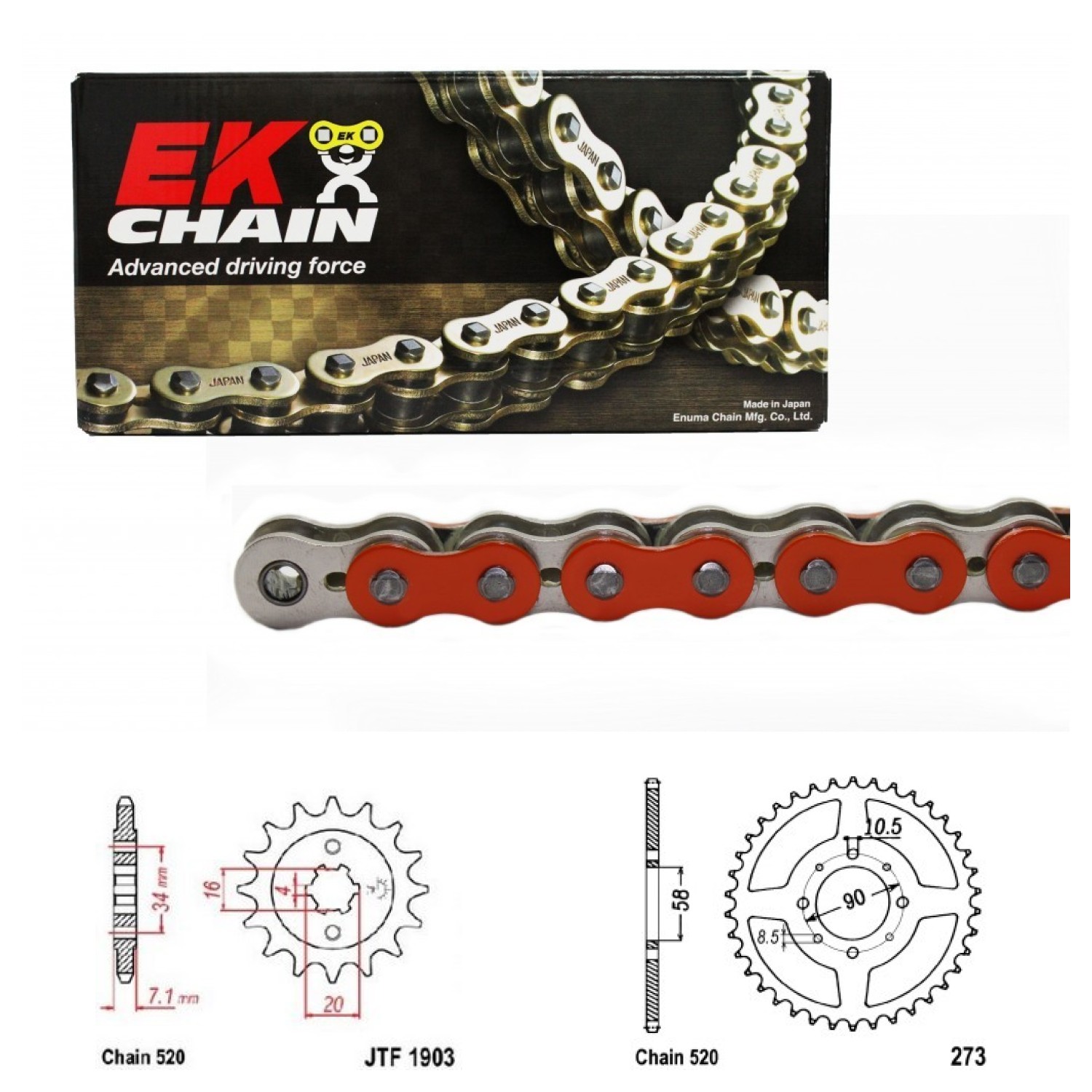 Řetězová sada EK MRD7 ORANGE, KTM 200 Duke rok výroby 2012-2014, Řetěz EK 520 MRD7, bezkroužkový, oranžový, počet článků 110, kolečko 1903-14 zubů, rozeta 0273-42 zubů.