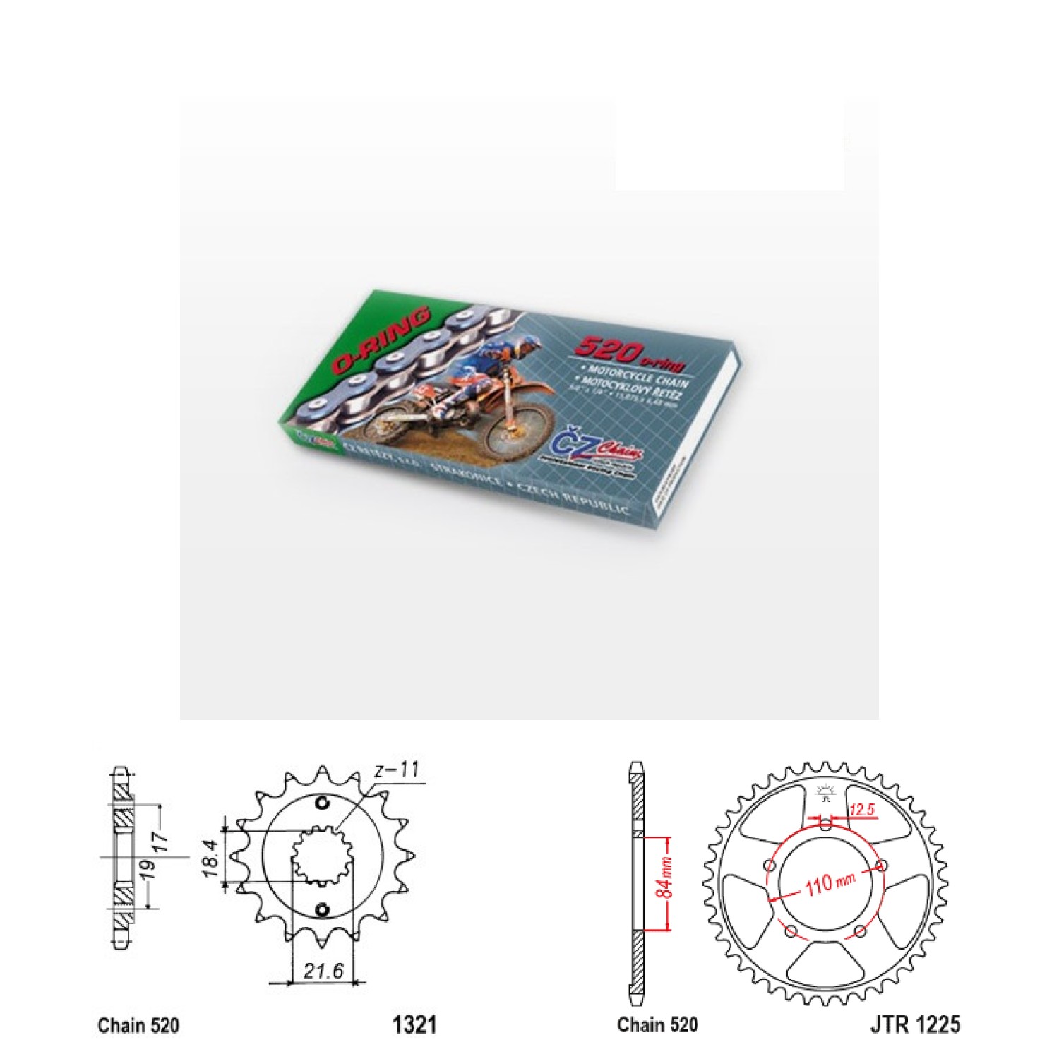 Řetězová sada s ČZ O-ring, HONDA CMX 300 Rebel rok výroby 2017-2025, Řetěz ČZ 520 ORM, O-ring, počet článků 120, kolečko 1321-14 zubů, rozeta 1225-36 zubů.