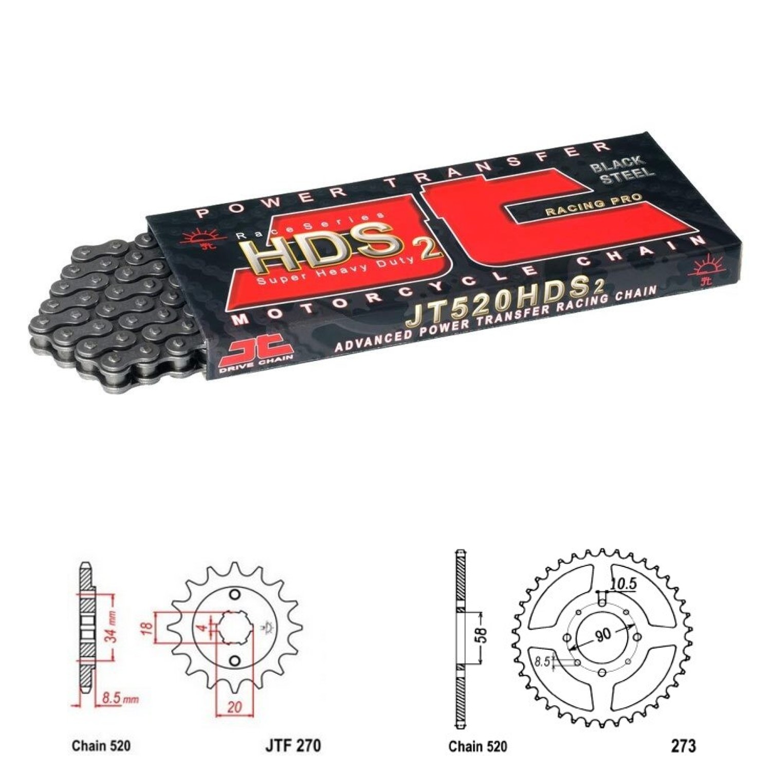 Řetězová sada JT, HONDA CA 125 Rebel rok výroby 1995-2001, Řetěz JT 520 HDS, bezkroužkový, zesílený, počet článků 112, kolečko 270-13 zubů, rozeta 0273-39 zubů.