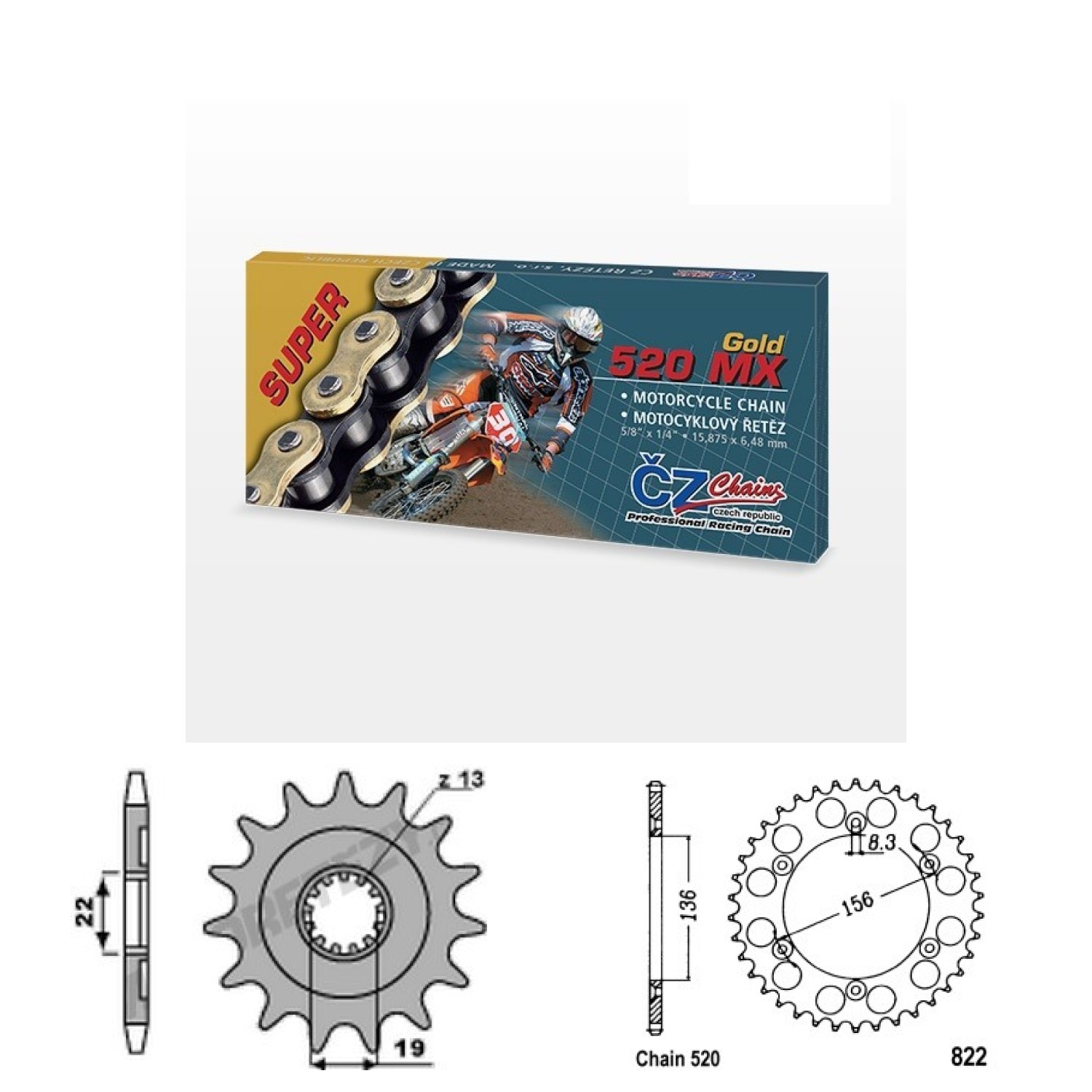Řetězová sada s ČZ MX GOLD, HUSQVARNA 310 TE rok výroby 2011-2013, Řetěz ČZ 520 MX, bezkroužkový, zlatý, počet článků 112, kolečko 825-13 zubů, rozeta 0822-50 zubů.