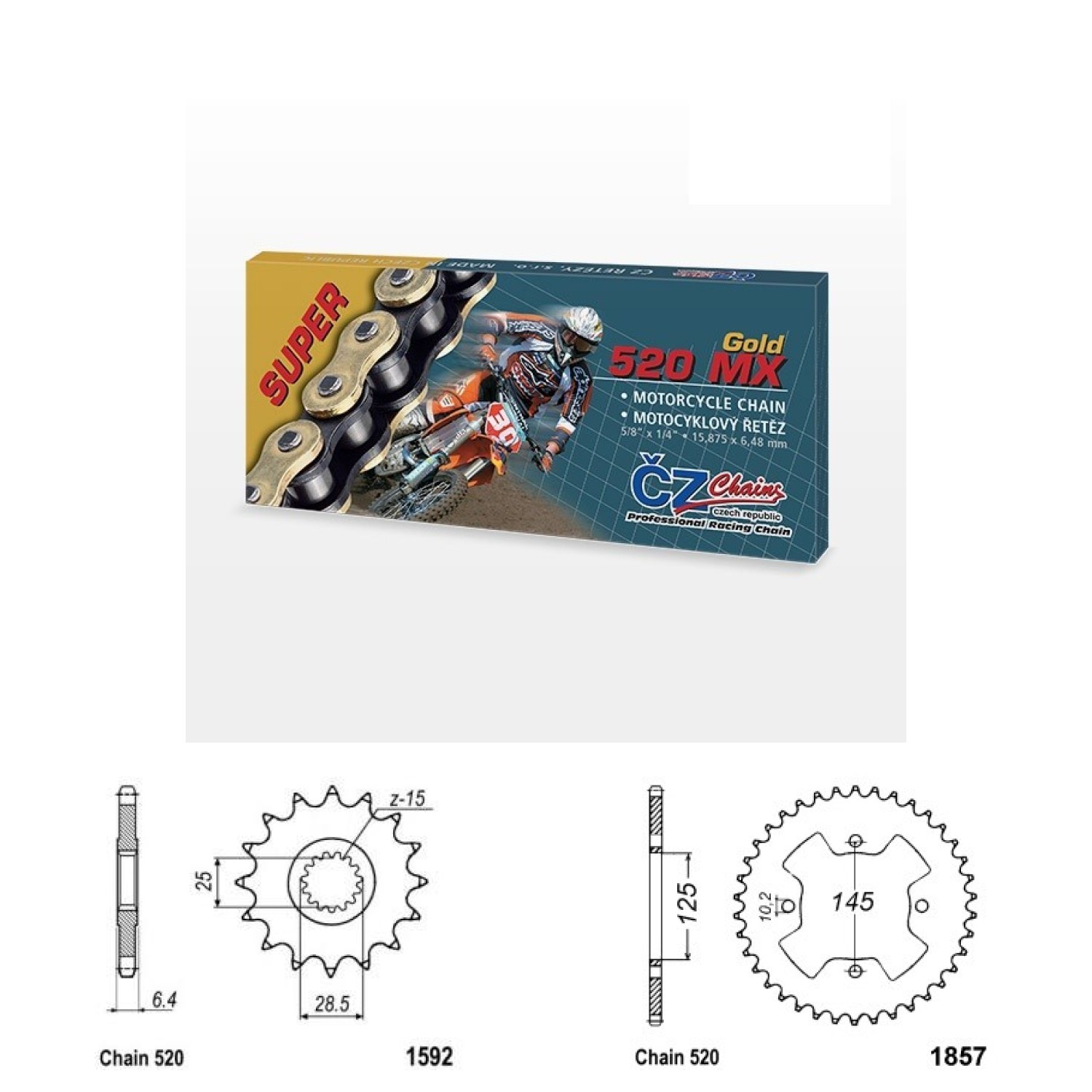 Řetězová sada s ČZ MX GOLD, YAMAHA YFZ 450 R, X rok výroby 2009-2024, Řetěz ČZ 520 MX, bezkroužkový, zlatý, počet článků 98, kolečko 1592-14 zubů, rozeta 1857-38 zubů.
