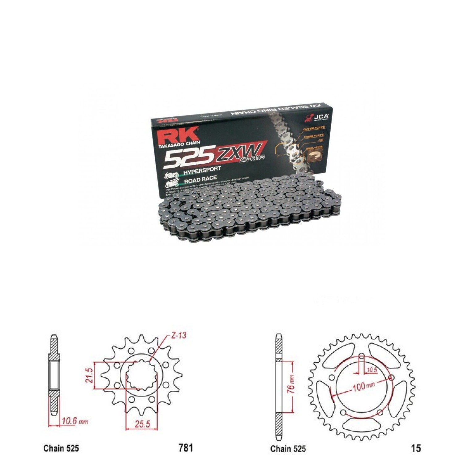 Řetězová sada RK ZW-ring, BENELLI 500 Leoncino rok výroby 2019-2025, Řetěz RK 525 ZXW, XW-ring, počet článků 112, kolečko 781-14 zubů, rozeta 15-44 zubů.