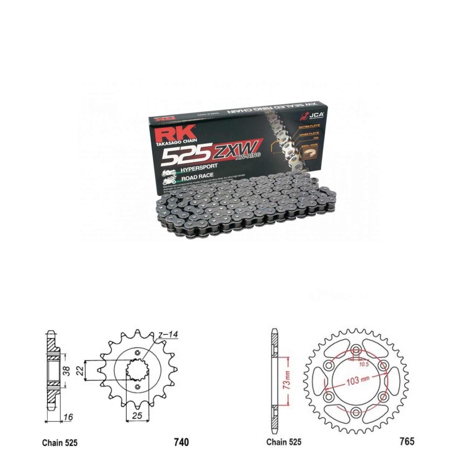 Řetězová sada RK ZW-ring, DUCATI 950 Multistrada rok výroby 2017-2024, Řetěz RK 525 ZXW, XW-ring, počet článků 114, kolečko 740-15 zubů, rozeta 765-43 zubů.