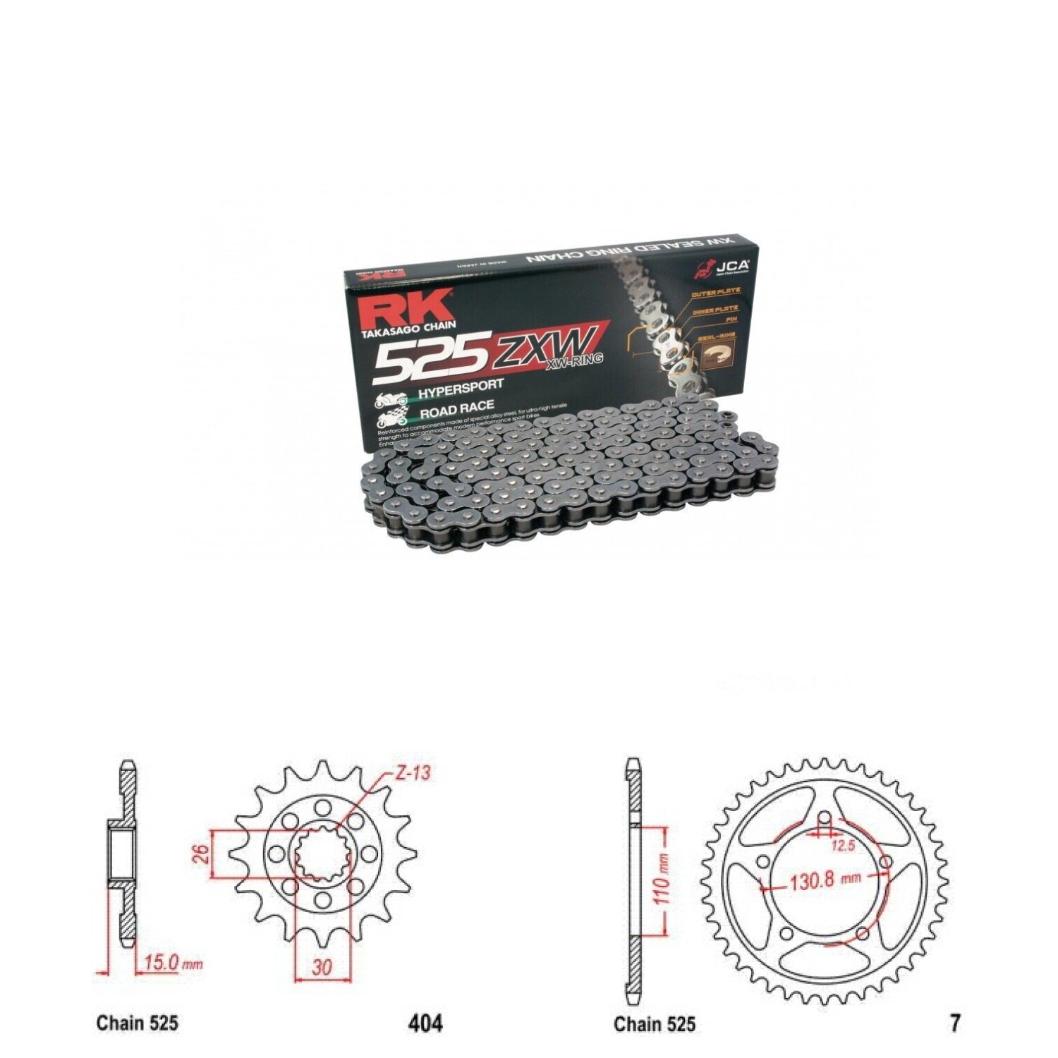 Řetězová sada RK ZW-ring, BMW S 1000 XR rok výroby 2014-2019, Řetěz RK 525 ZXW, XW-ring, počet článků 128, kolečko 404-17 zubů, rozeta 0007-45 zubů.