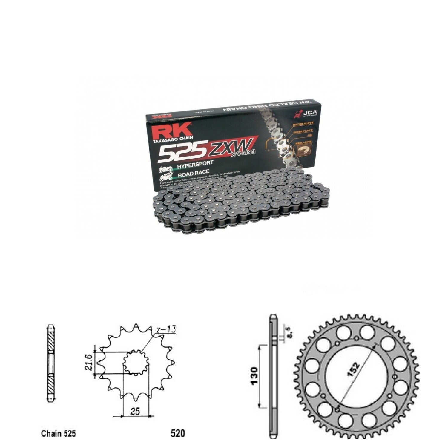Řetězová sada RK ZW-ring, CAGIVA 1000 Navigator rok výroby 2001-2004, Řetěz RK 525 ZXW, XW-ring, počet článků 108, kolečko 520-16 zubů, rozeta P4424-41 zubů.