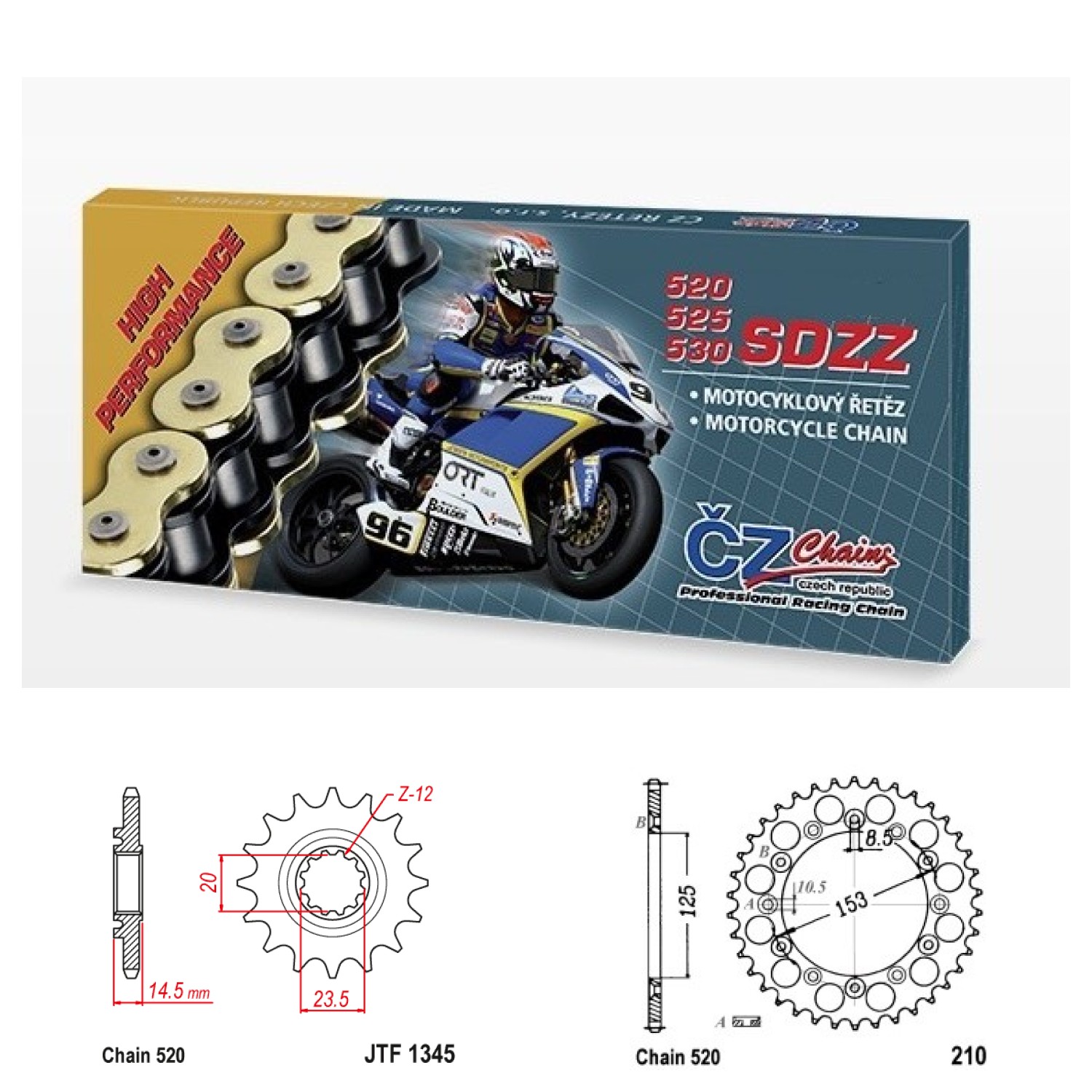 ČZ 520 SDZZ je vysokopevnostní řetěz vyvíjený pro stroje s velkým výkonem - z hlediska bezpečnosti používejte pouze nýtovací spojku. Rozebíratelnou spojku u tohoto řetězu používejte jen pro motocykly s menším výkonem – do cca 35kW. Vždy nutno dodržet pokyny v manuálu motocyklu nebo s námi konzultujte.