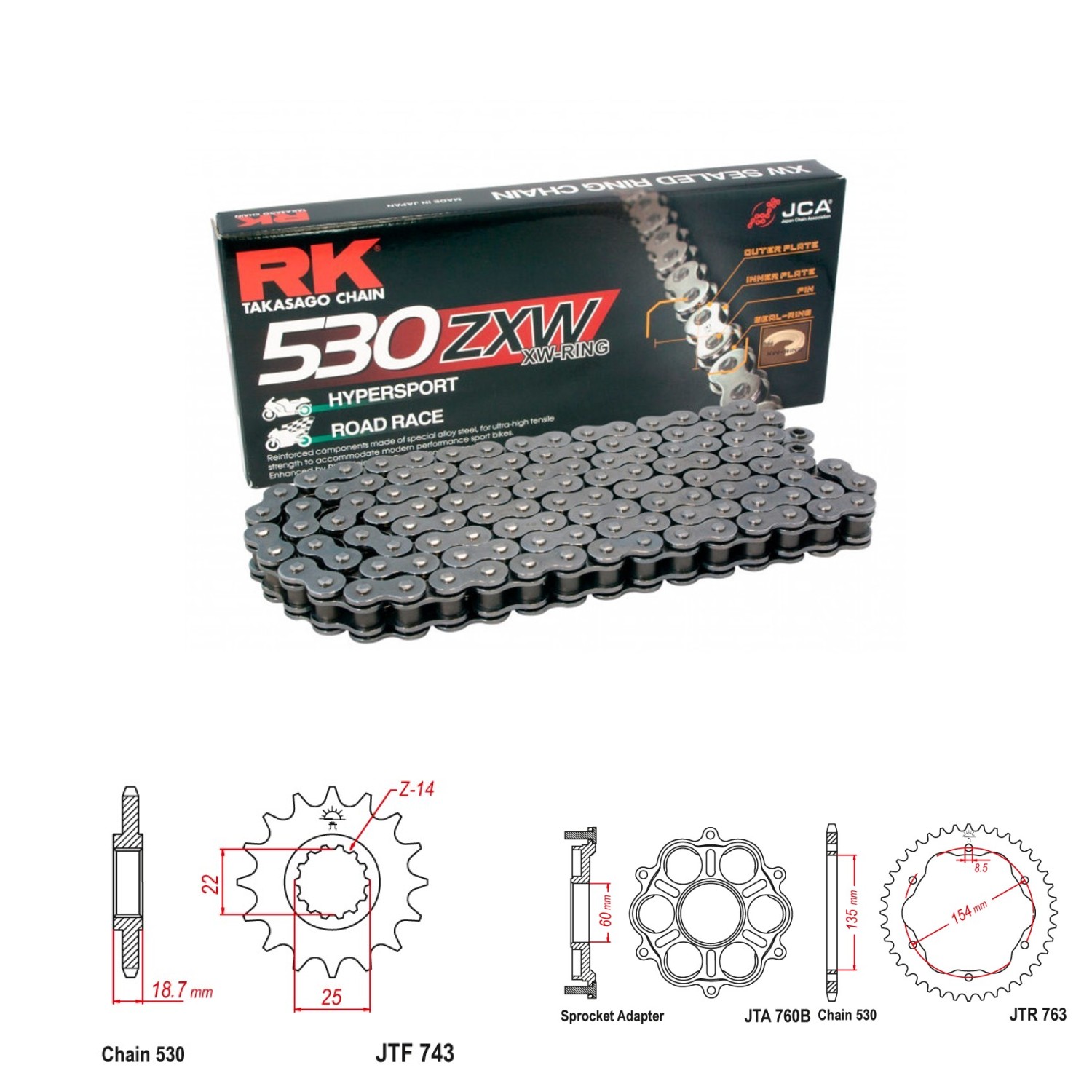 Řetězová sada RK ZW-ring, DUCATI 1200 Multistrada rok výroby 2010-2017, Řetěz RK 530 ZXW, XW-ring, počet článků 108, kolečko 743-15 zubů, rozeta 763-40 zubů.