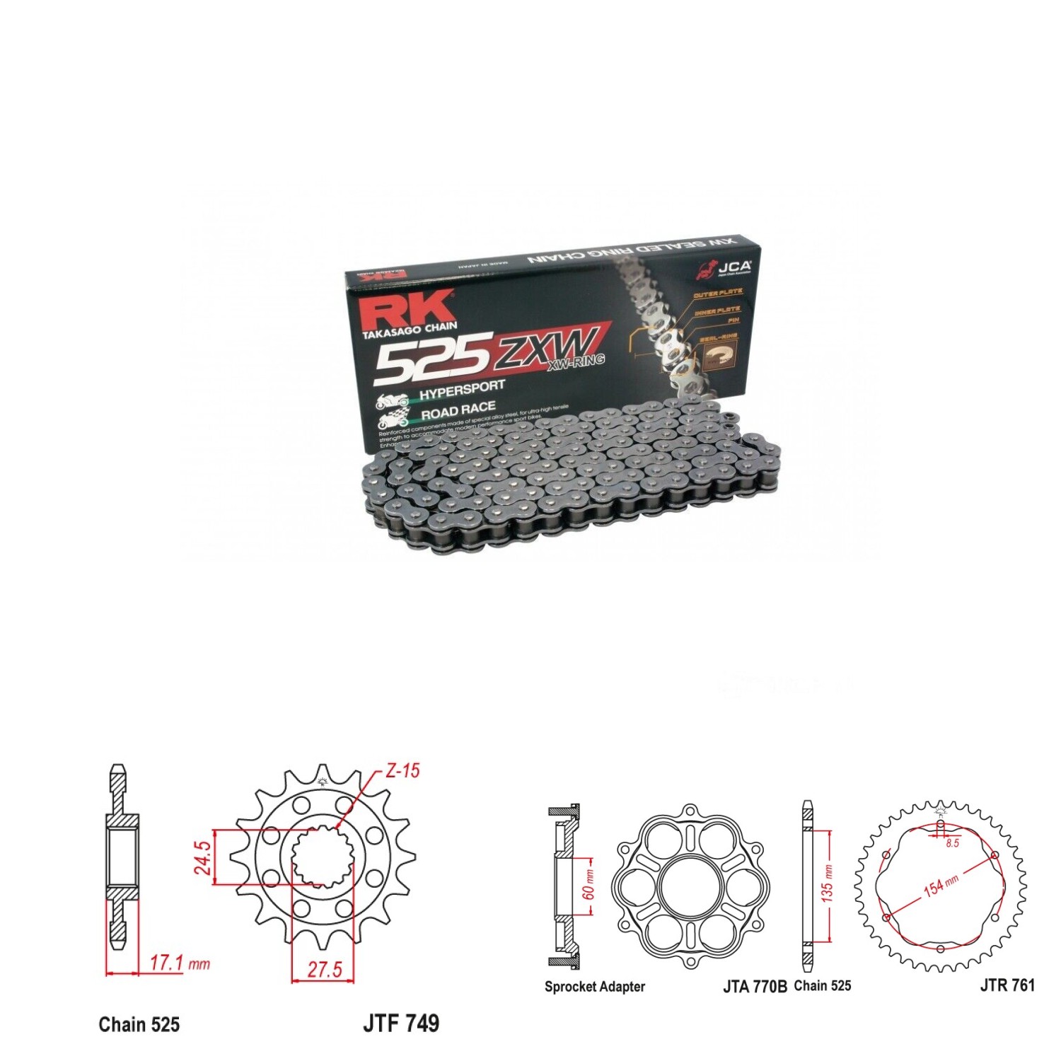 Řetězová sada RK ZW-ring, DUCATI 1103 Panigale V4 rok výroby 2018-2023, Řetěz RK 525 ZXW, XW-ring, počet článků 114, kolečko 749-16 zubů, rozeta 761-41 zubů.