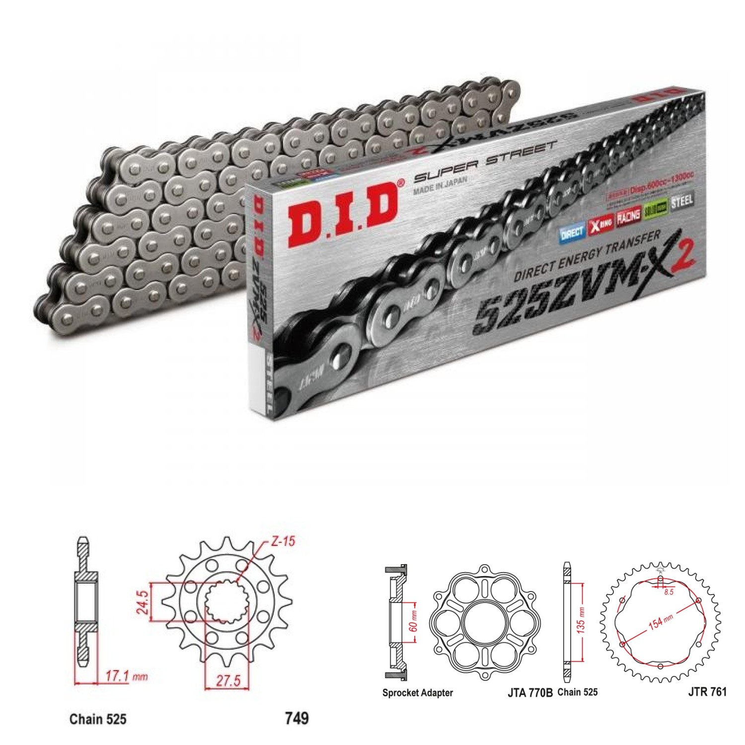 D.I.D. 525 ZVM-X2 - nejvyšší řada DID, o 10% větší odolnost proti opotřebení než předchozí řada ZVM2. Řetězy s X® těsnícími kroužky určené pro vysokovýkonné sportovní a sportovněcestovní motocykly. Jejich výrazně delší životnost jsme sami ověřili i při našich testech. Řada 525 ZVM-X2 je ideální pro 2V motocykly (Honda Varadero, V-strom, Aprilia RSV,...) pro výborné provozní vlastnosti a životnost.