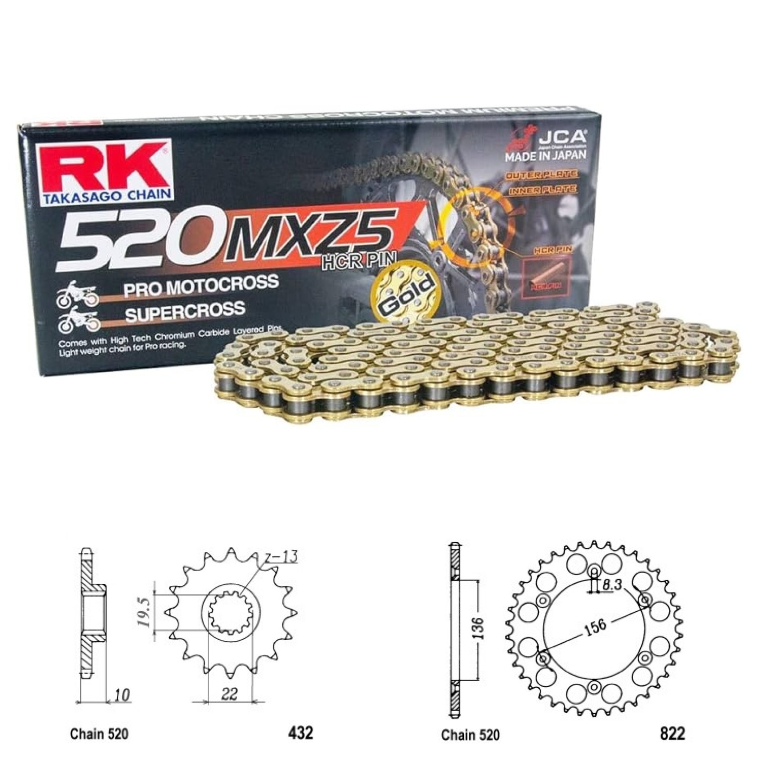 RK 520 MXZ5 - jeden z nejlepších MX (bezkroužkový - netěsněný) řetězů, který je k dispozici na současném trhu. Vyroben speciálně pro motokrosové závodníky. Řetěz vyniká svojí váhou (1,31kg/100čl.) a maximální pevností v tahu 40 kN.