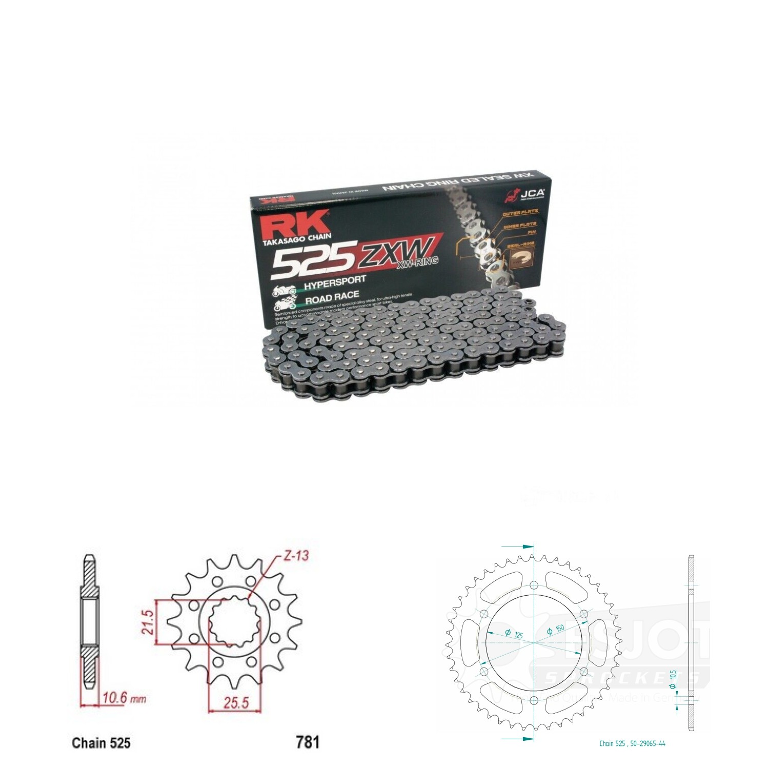 Řetězová sada RK ZW-ring, BENELLI TRK 502 X rok výroby 2018-2025, Řetěz RK 525 ZXW, XW-ring, počet článků 116, kolečko 781-14 zubů, rozeta 50-29065-44 zubů.