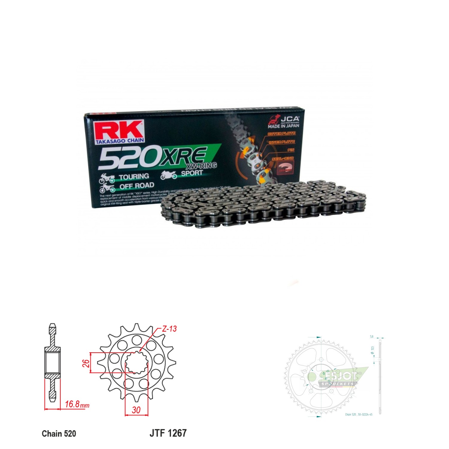 Řetězová sada RK W-ring, HONDA XL 750 Transalp rok výroby 2023-2025, Řetěz RK 520 XRE, XW-ring, počet článků 126, kolečko 1267-16 zubů, rozeta 1330-45 zubů.