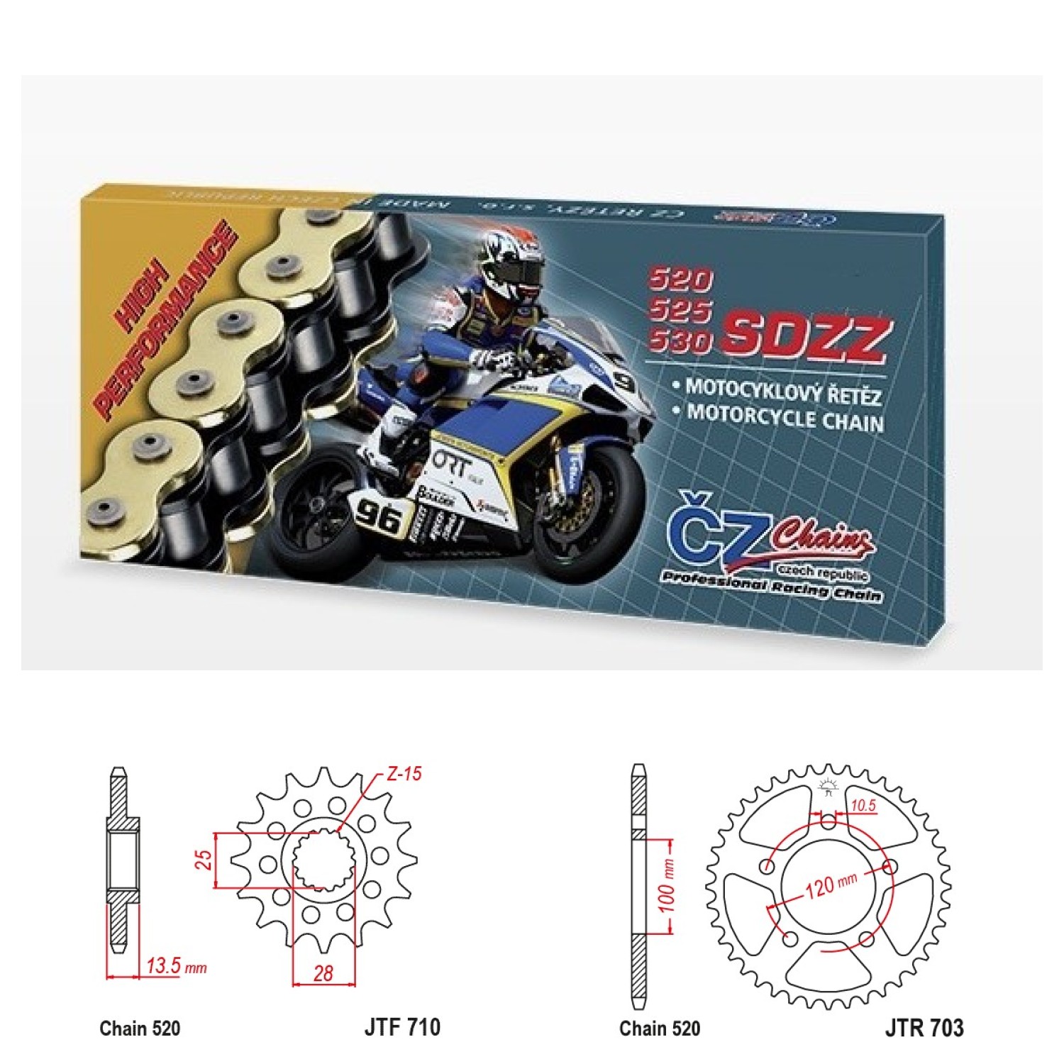 ČZ 520 SDZZ je vysokopevnostní řetěz vyvíjený pro stroje s velkým výkonem - z hlediska bezpečnosti používejte pouze nýtovací spojku. Rozebíratelnou spojku u tohoto řetězu používejte jen pro motocykly s menším výkonem – do cca 35kW. Vždy nutno dodržet pokyny v manuálu motocyklu nebo s námi konzultujte.
