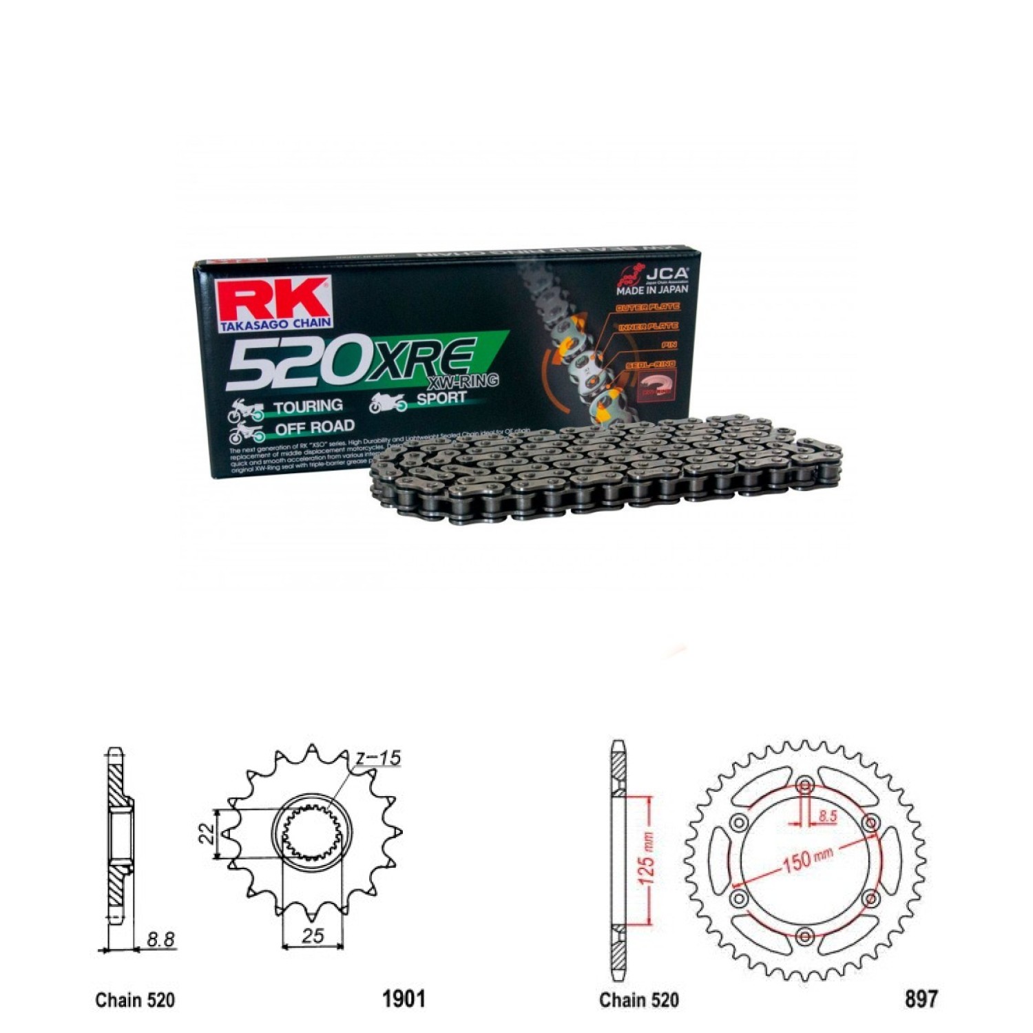 RK 520 XRE - střední řada RK řetěz s těsnícím "XW" kroužkem, ideální pro silnější moto v běžném provozu
