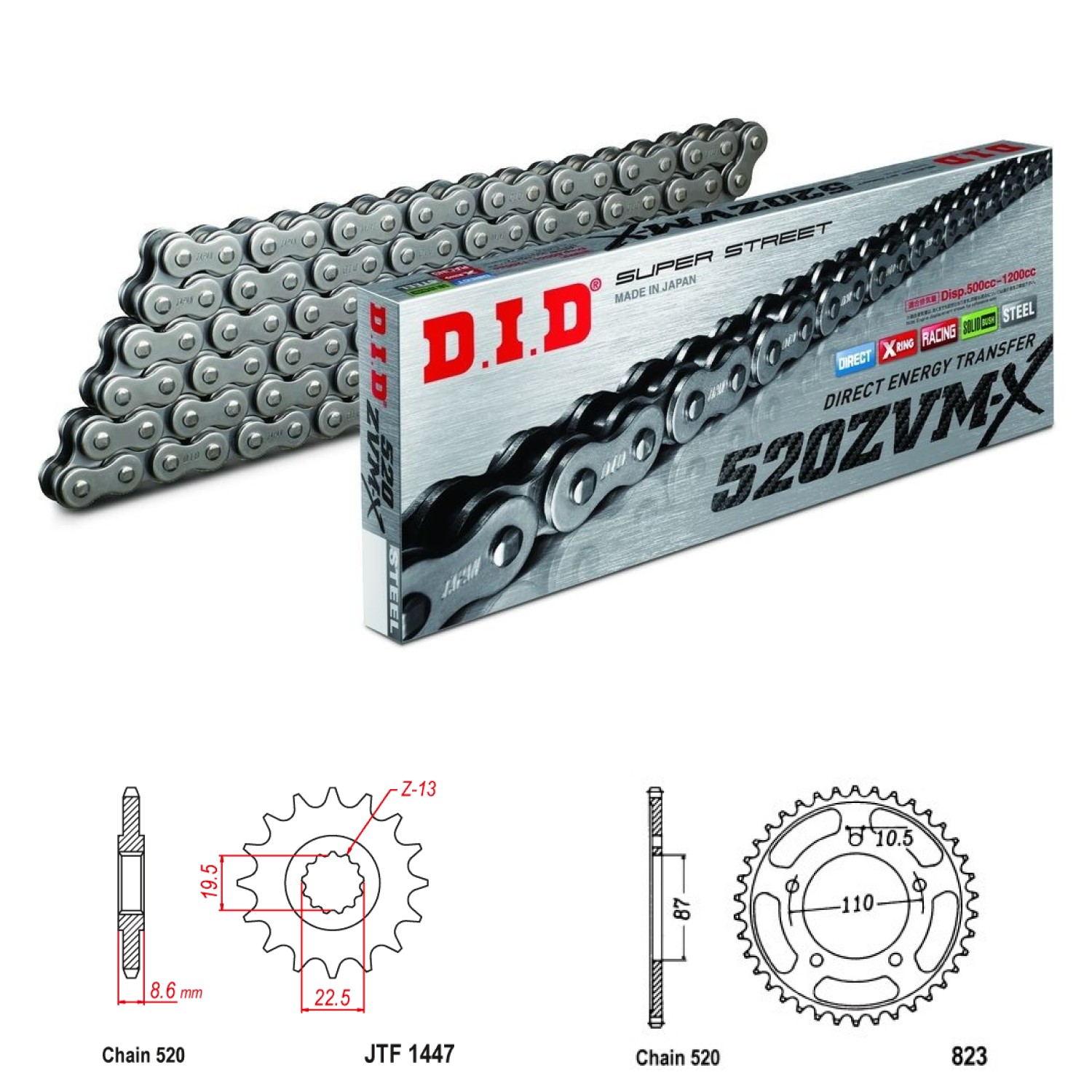 DID Řetězová sada D.I.D XX-ring, SUZUKI GSX 250 R rok výroby 2020-2023, Řetěz DID 520 ZVMX, X-ring, počet článků 116, kolečko 1447-14 zubů, rozeta 823-47 zubů.