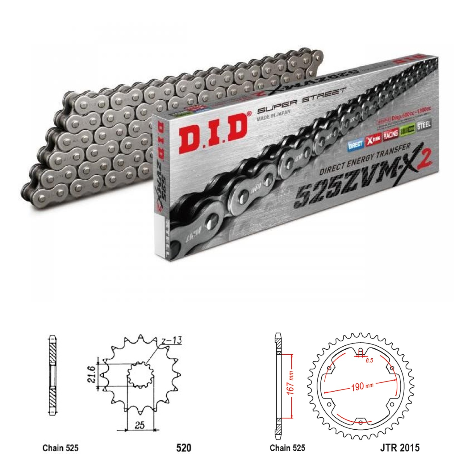 D.I.D. 525 ZVM-X2 - nejvyšší řada DID, o 10% větší odolnost proti opotřebení než předchozí řada ZVM2. Řetězy s X® těsnícími kroužky určené pro vysokovýkonné sportovní a sportovněcestovní motocykly. Jejich výrazně delší životnost jsme sami ověřili i při našich testech. Řada 525 ZVM-X2 je ideální pro 2V motocykly (Honda Varadero, V-strom, Aprilia RSV,...) pro výborné provozní vlastnosti a životnost.