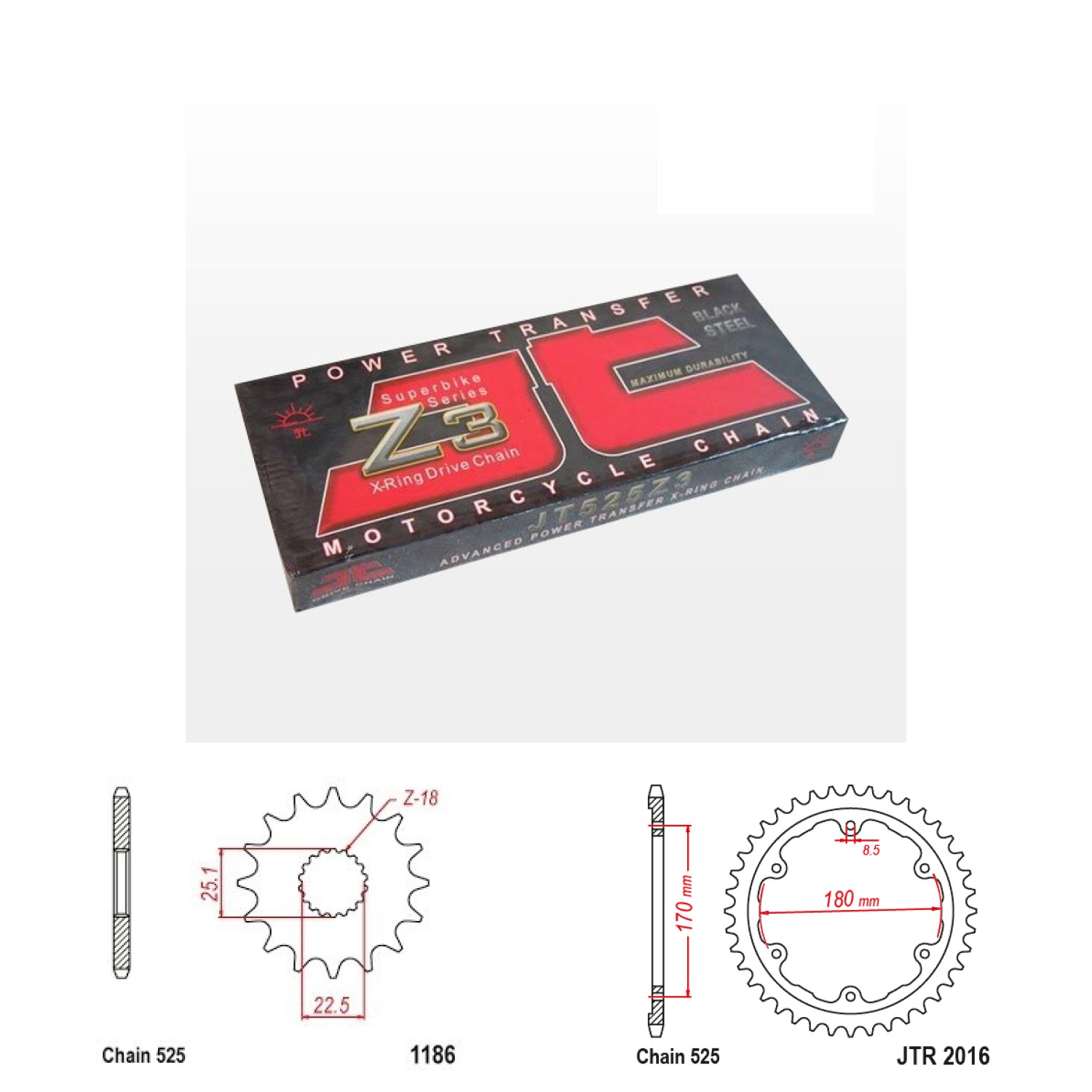 Řetězová sada JT ZX-ring, TRIUMPH 1200 SPEED TRIPLE RS rok výroby 2021-2023, Řetěz JT 525 Z3, X-ring, počet článků 118, kolečko 1186-17 zubů, rozeta 2016-44 zubů.