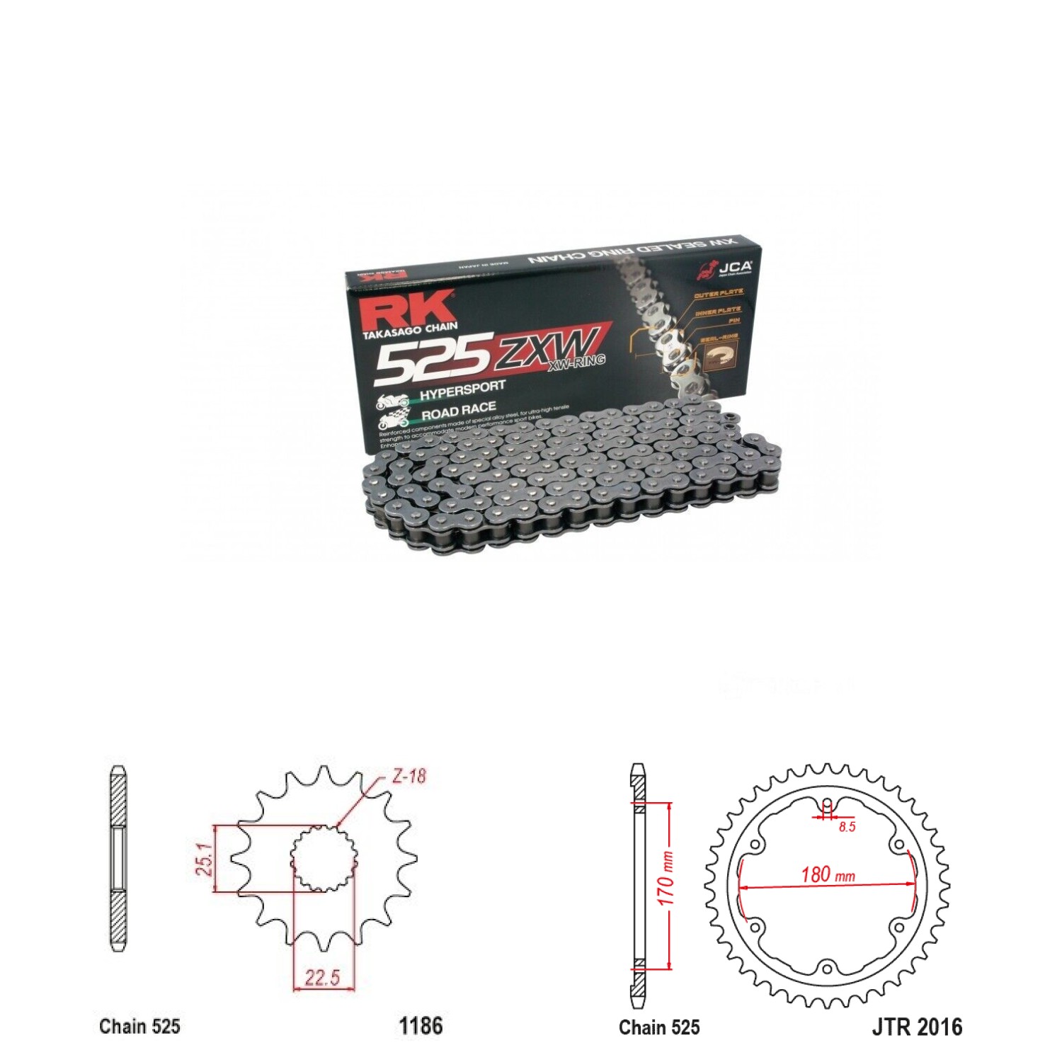 Řetězová sada RK ZW-ring, TRIUMPH 1200 SPEED TRIPLE RS rok výroby 2021-2023, Řetěz RK 525 ZXW, XW-ring, počet článků 118, kolečko 1186-17 zubů, rozeta 2016-44 zubů.